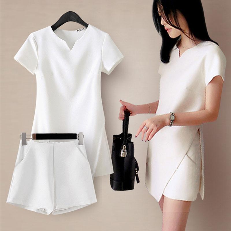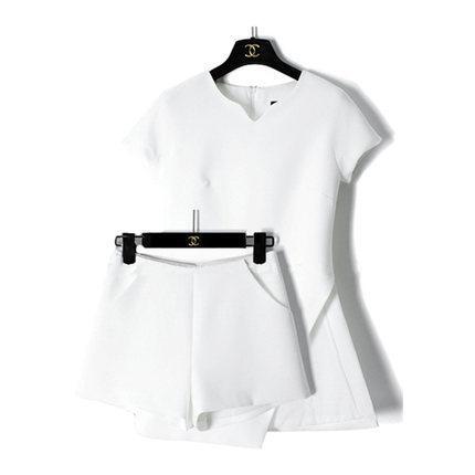 シンプル半袖シャツ+無地ショット丈パンツスリットセットアップ 【DL-179】