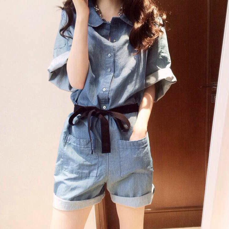 着痩せデニム半袖折り襟ショット丈パンツデニムオールインワン 【DL-187】