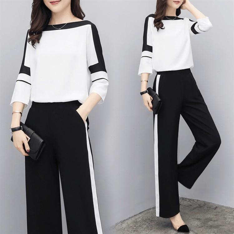 ストライプ柄配色切り替え夏秋長袖トップスズボンカジュアルセットアップ 【DL-195】