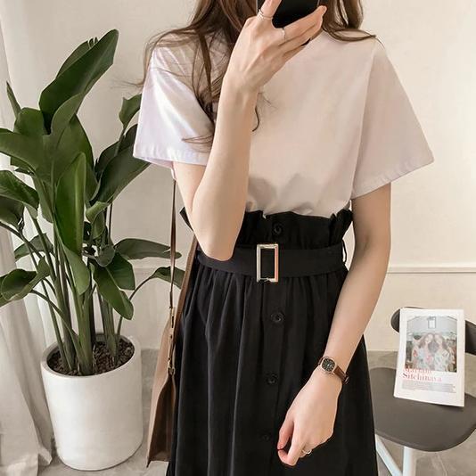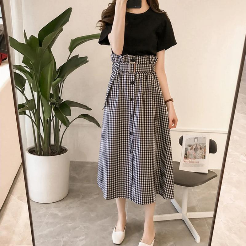 無地トップスチェック柄ハイウエストAラインスカートセットアップ 【DL-199】