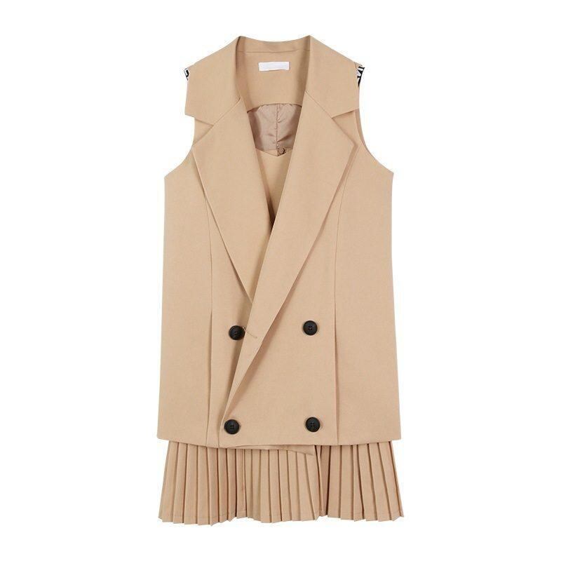 無地ロング丈ベスト無袖ワンピースプリーツ切り替えボタン付きセットアップ 【DL-204】