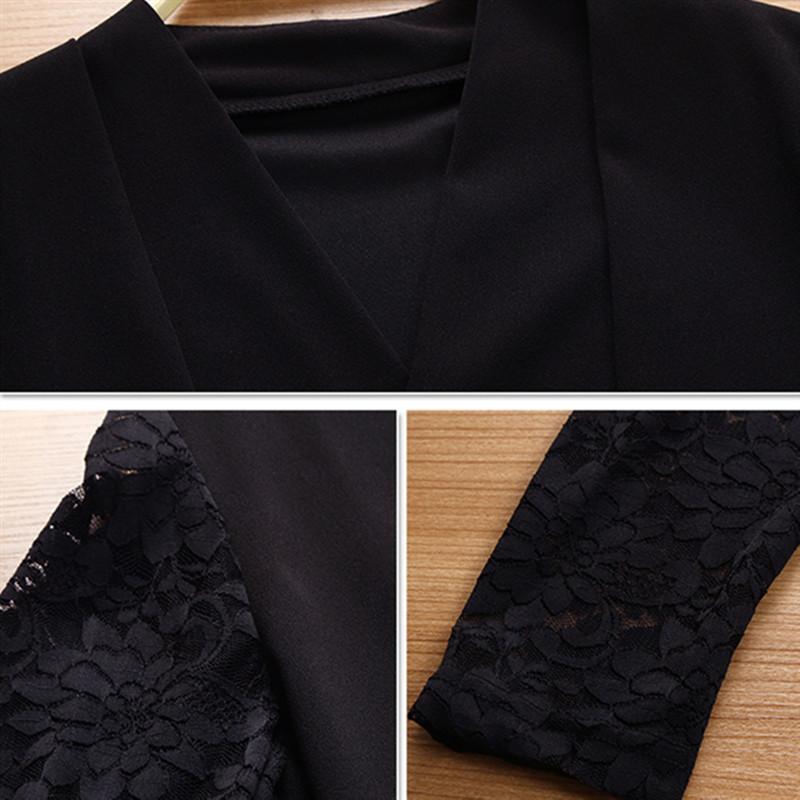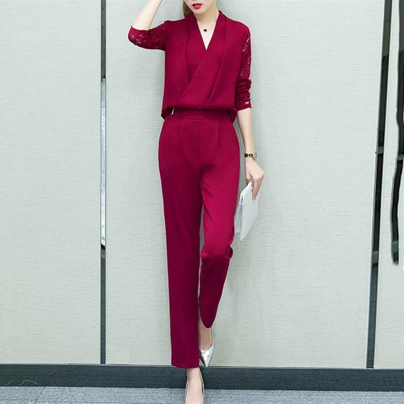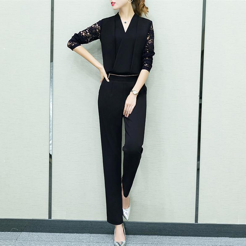無地レース切り替えオールインワンチャック付き透かし彫り袖通勤OLセットアップ 【DL-205】