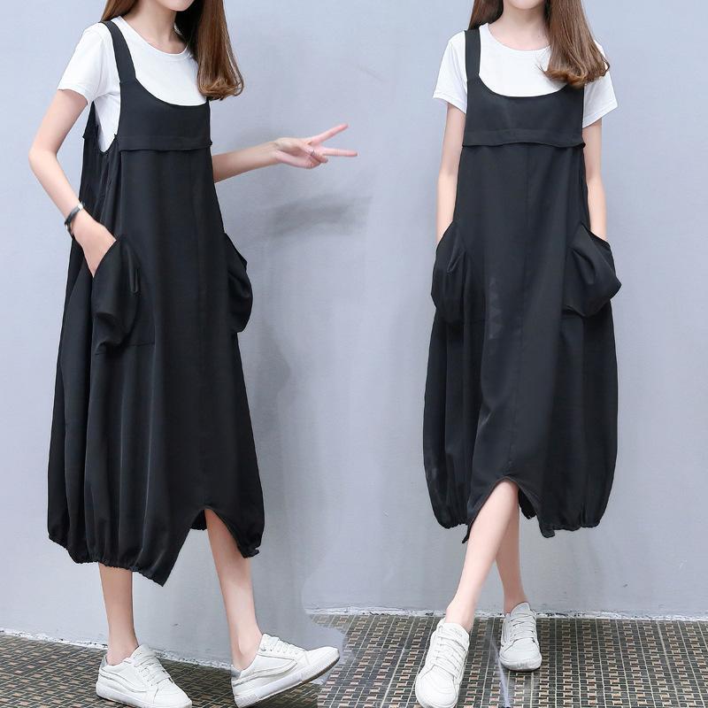 カジュアルシンプル半袖ティーシャツ ゆったりポケット付きノースリーブワンピースセットアップ 【DL-210】