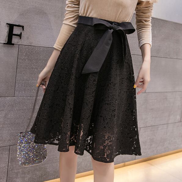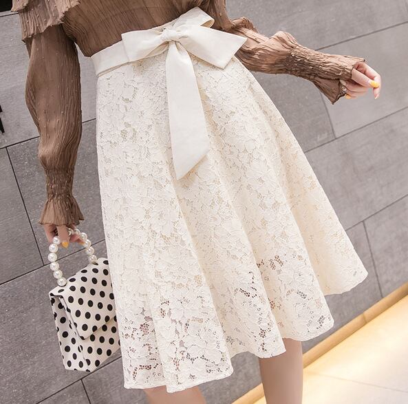 夏秋着やせボトムスレース無地ボウタイAライン膝丈スカート 【DL-217】