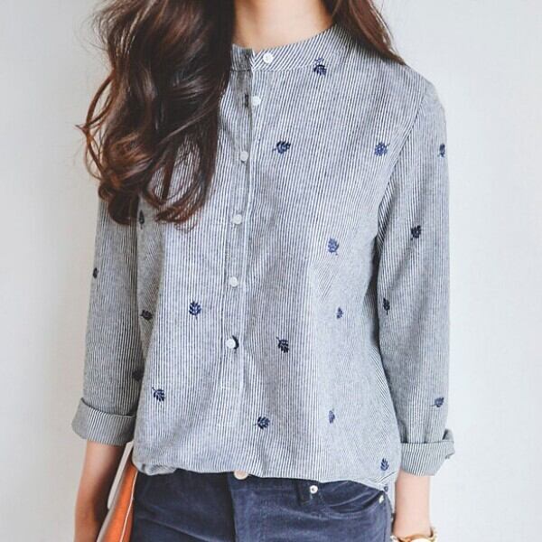着痩せストライプ柄刺繍スタンドネック長袖シャツ 【DL-244】