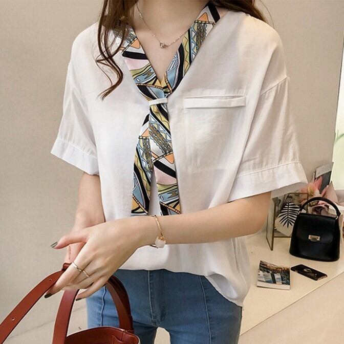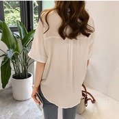 半袖Vネックプルオーバーリボン飾り切り替え無地Tシャツ 【DL-264】