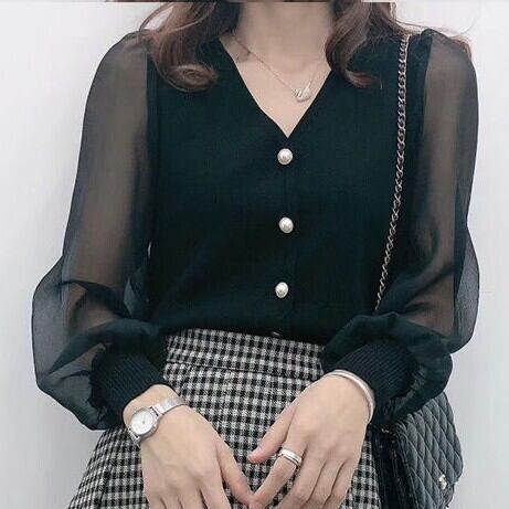 無地気質満点ゆったりレース 切り替えVネックシングルブレストTシャツ 【DL-269】