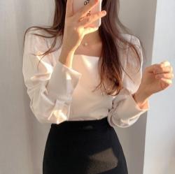 シンプルスウィート長袖スクエアネックボタン無地シャツ 【DL-273】