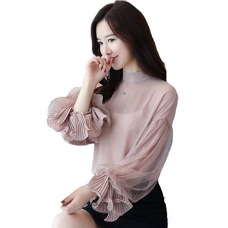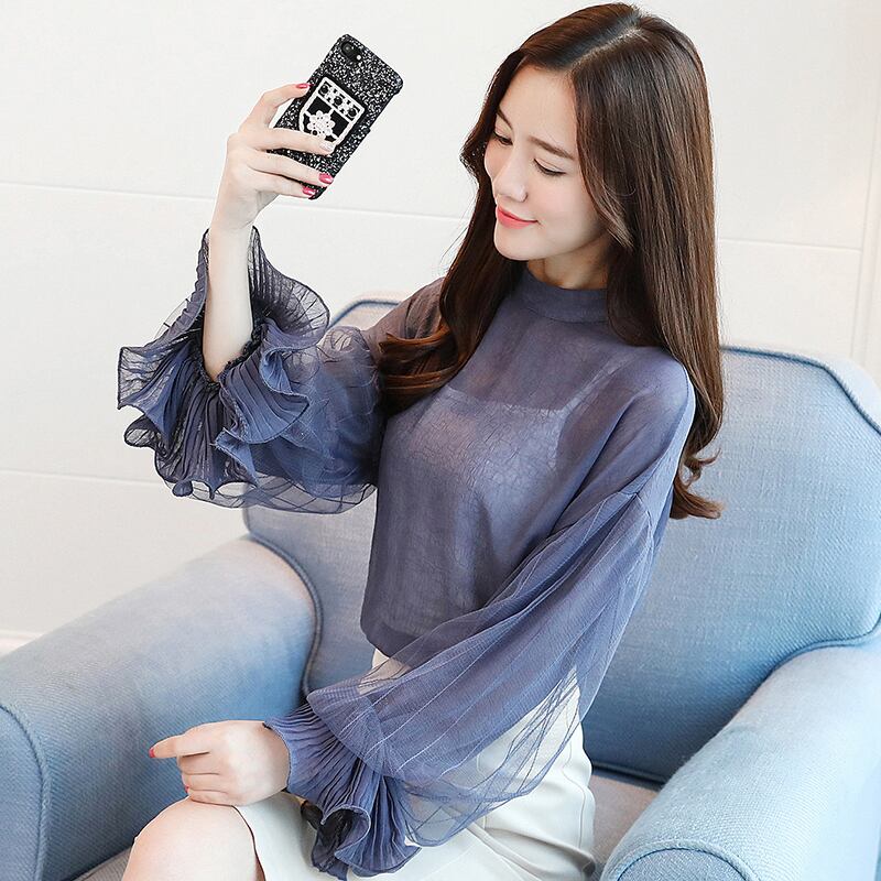 ルーズ 無地パフスリーブラウンドネックシフォンブラウス 【DL-274】
