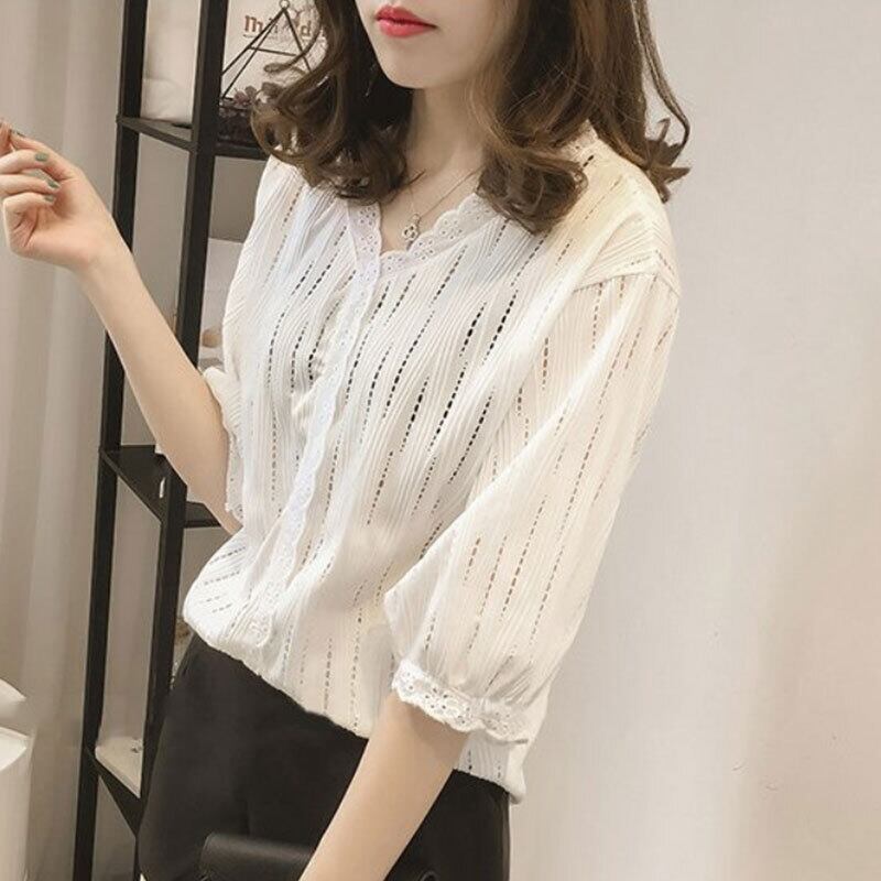 シンプルスウィート無地Vネック切り替え透かし彫りブラウス 【DL-283】