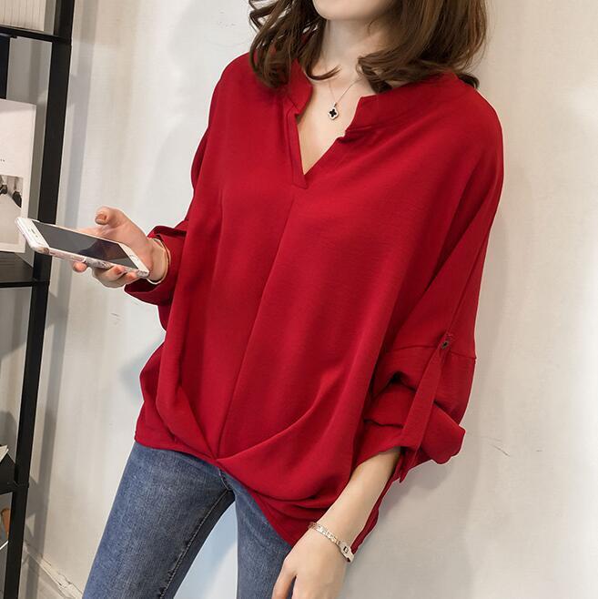 夏秋長袖シンプルドルマンスリーブVネック無地ブラウス 【DL-285】