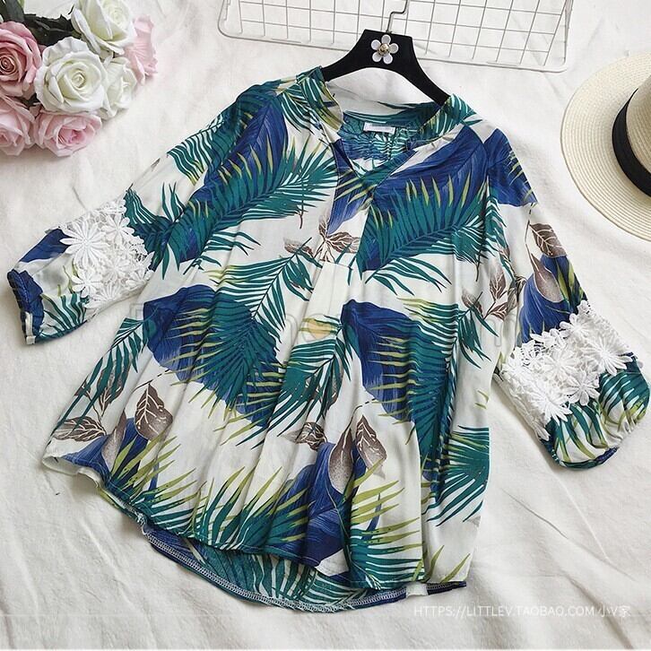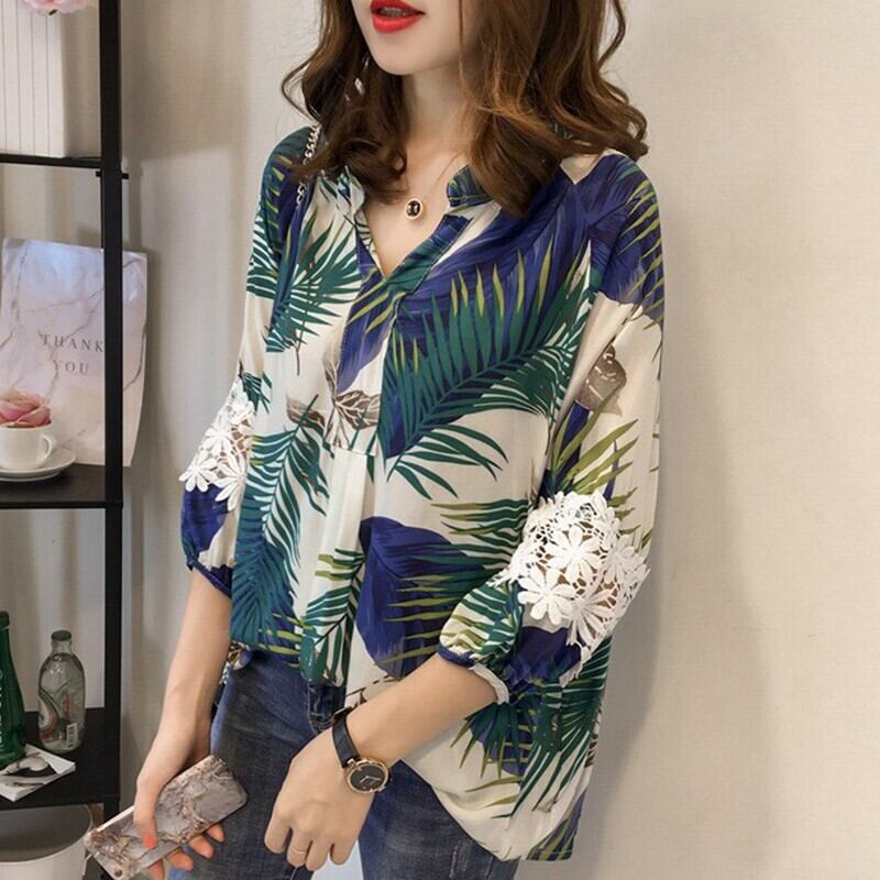 Vネック刺繍切り替えプリント ボタニカル 柄 ブラウス 【DL-295】