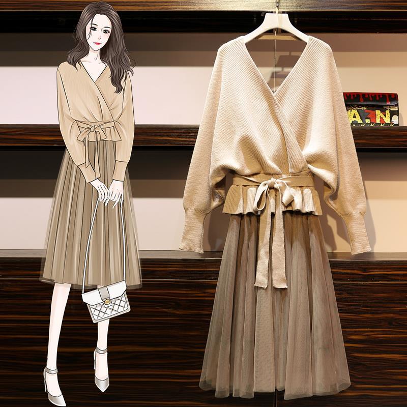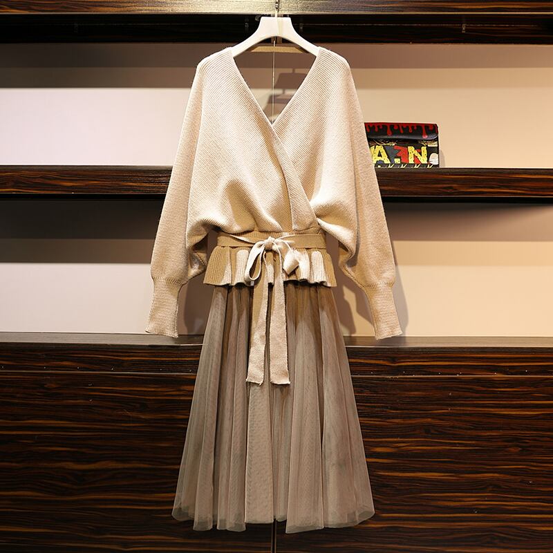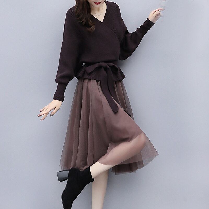 秋冬長袖パフスリーブVネックベルト付きハイウエストAラインスカート無地セットアップ 【DL-511】