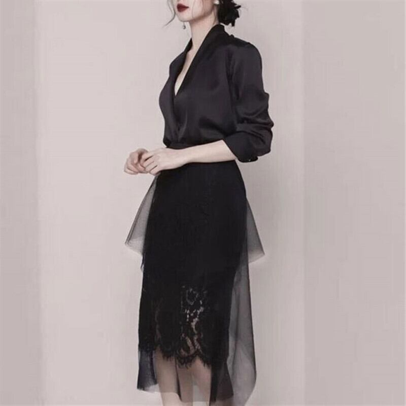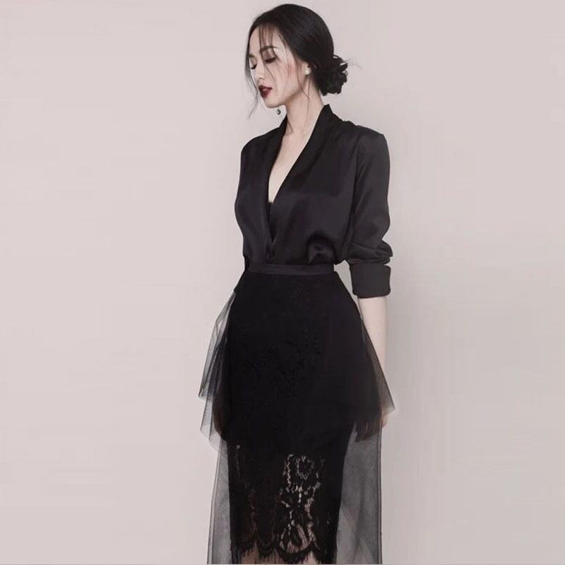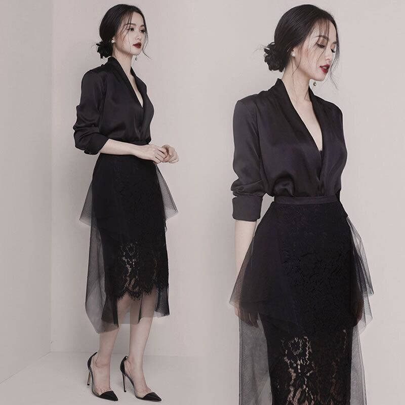 長袖ファッションVネックトップス+切り替えハイウエストスリム無地スカート レディースファッション 【DL-522】