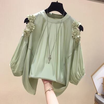 花刺繍付き無地リゾート肩開く半袖ブラウスシャツ 【DL-560】
