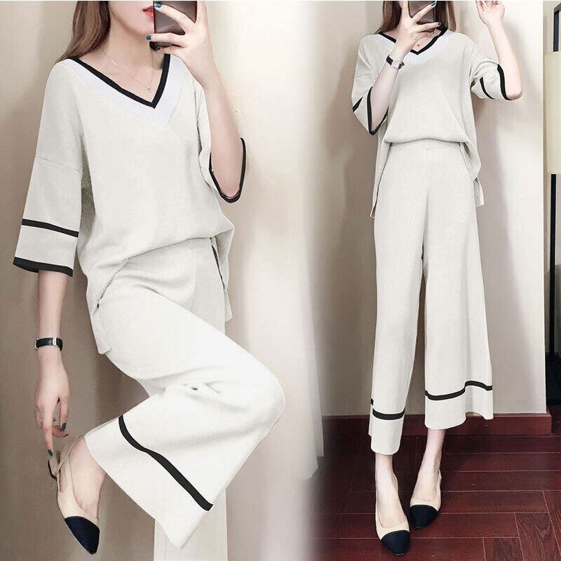 人気沸騰 カジュアル切り替えVネックTシャツ 配色ガウチョパンツスーツ【DL-579】