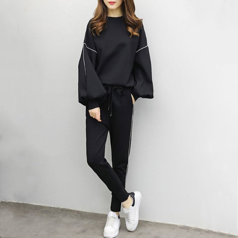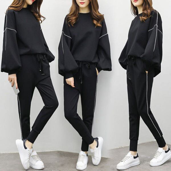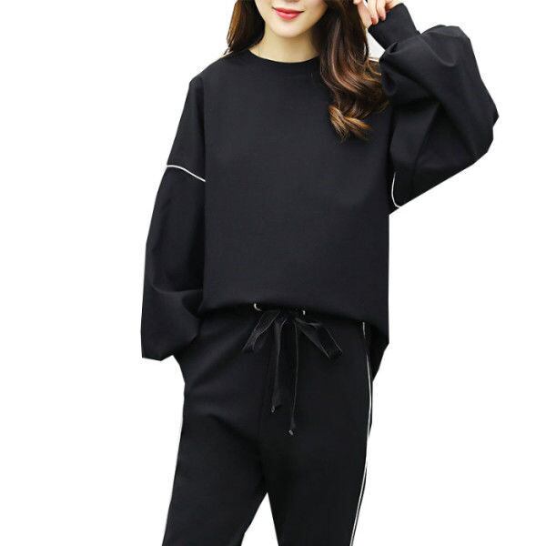 秋の必須アイテム 韓国系無地切り替えtシャツ+ハイウエストカジュアルパンツ2点セット 【DL-581】