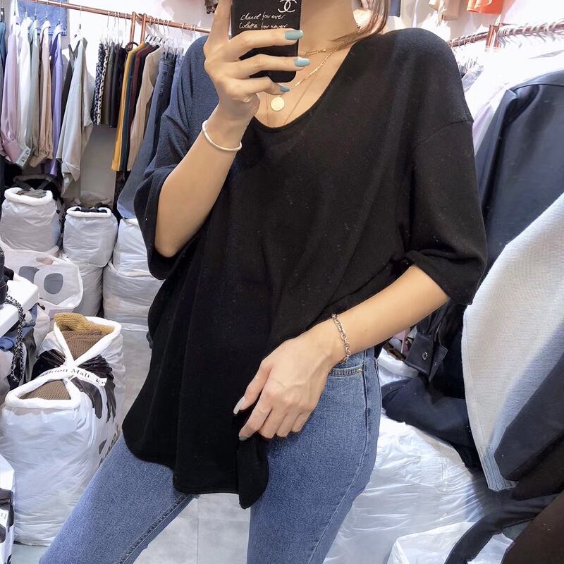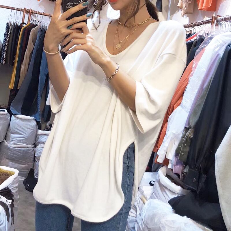 シンプルスリット半袖綿100%カジュアルリゾートTシャツ 【DL-653】