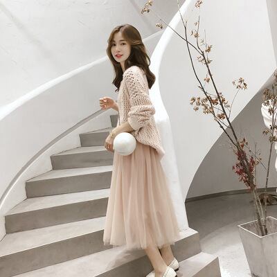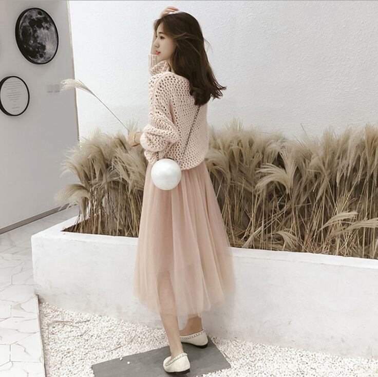 透かし彫り長袖トップス&チュールスカート着回しオシャレセットアップ 【DL-674】