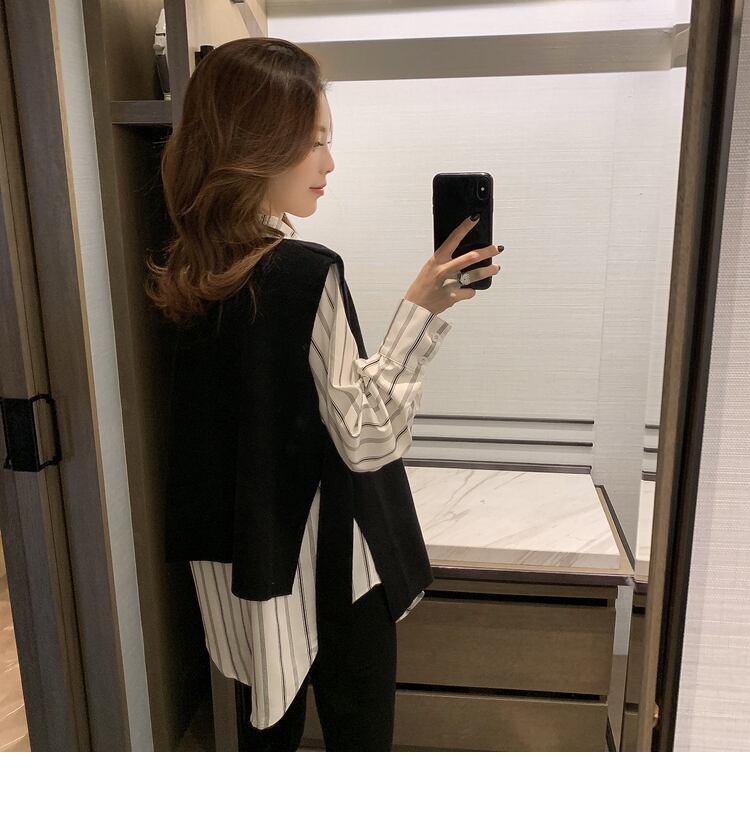 効果抜群大人可愛い カジュアル秋折り襟シングルブレスト切り替えストライプ柄シャツ&ベスト2点セット 【DL-746】