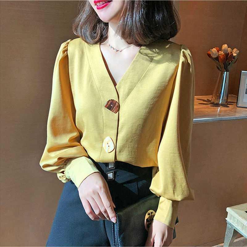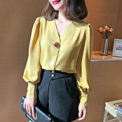 ボタン付き無地パフスリーブブラウス優雅通勤シャツ 【DL-750】