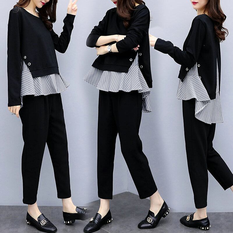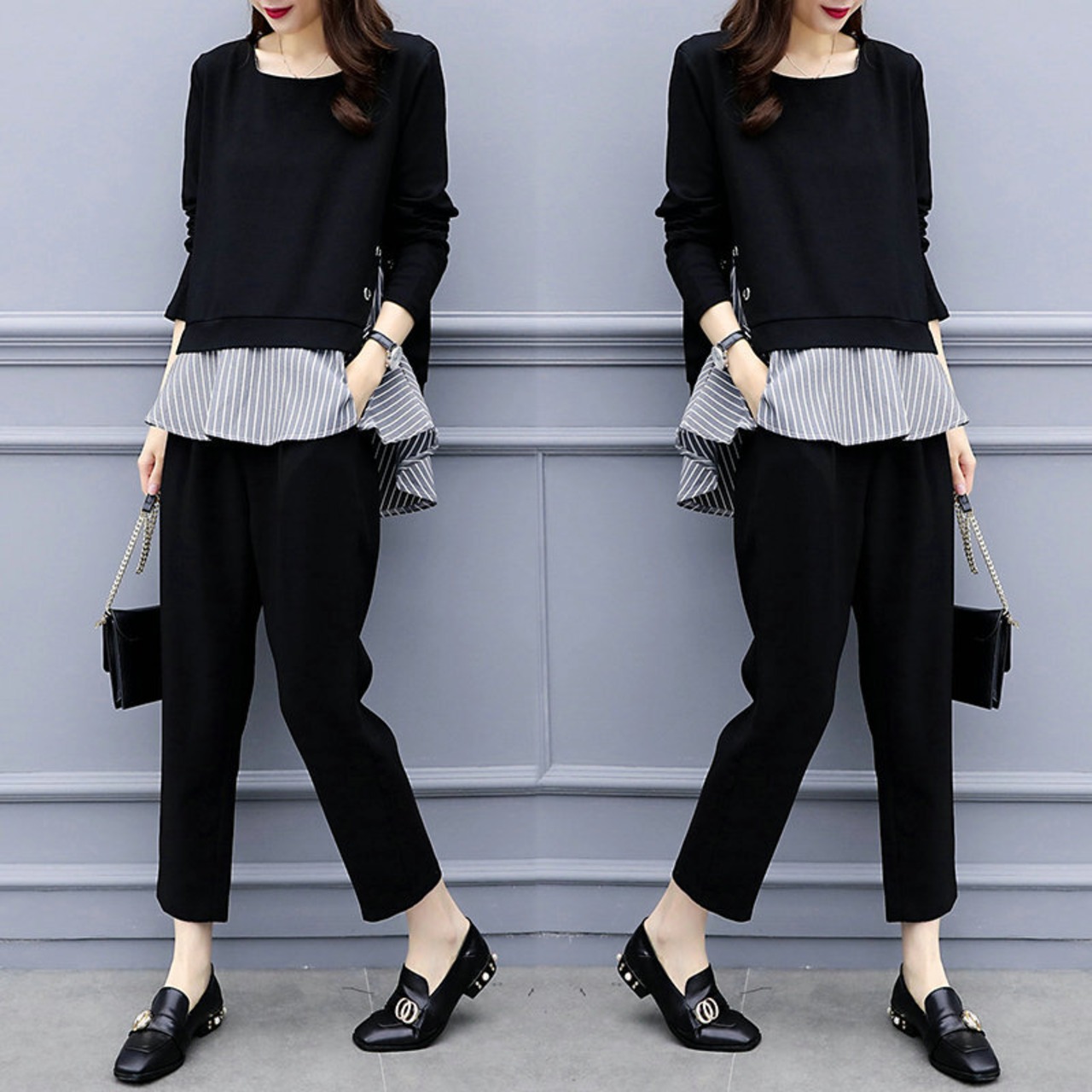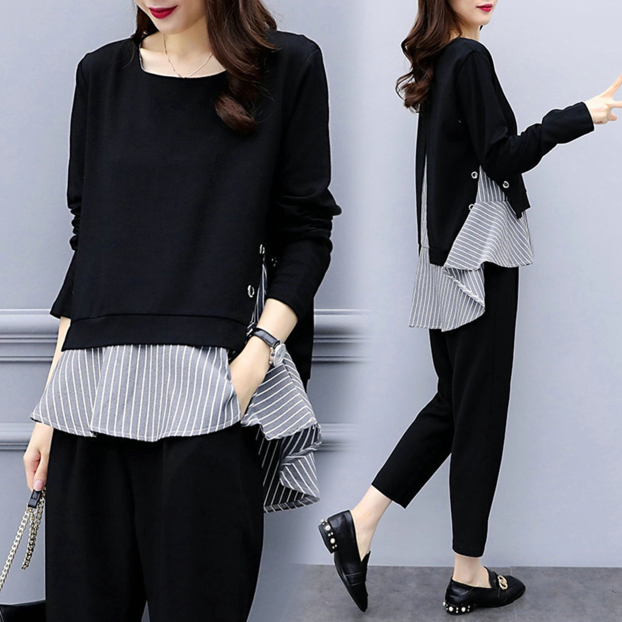 重ね風ストレイプ柄切り替えトップス&カジュアルパンツセットアップ 【DL-686】