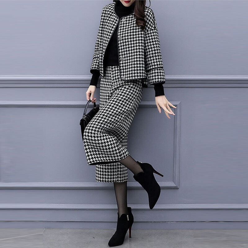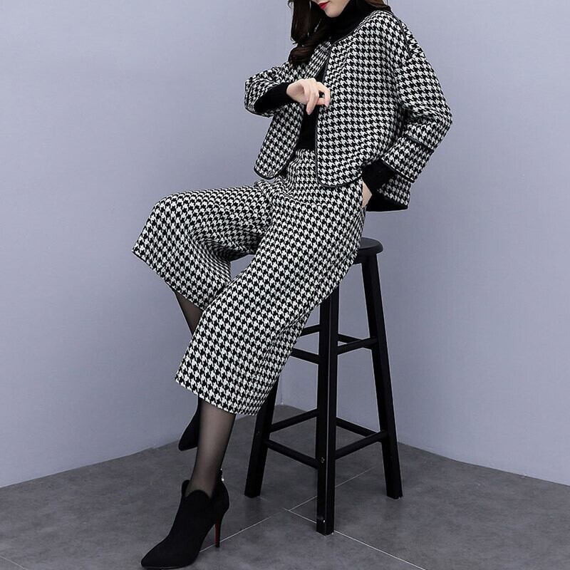 チェック柄千鳥格子ラシャコート&ガウチョ通勤OLスタイルセットアップ 【DL-766】