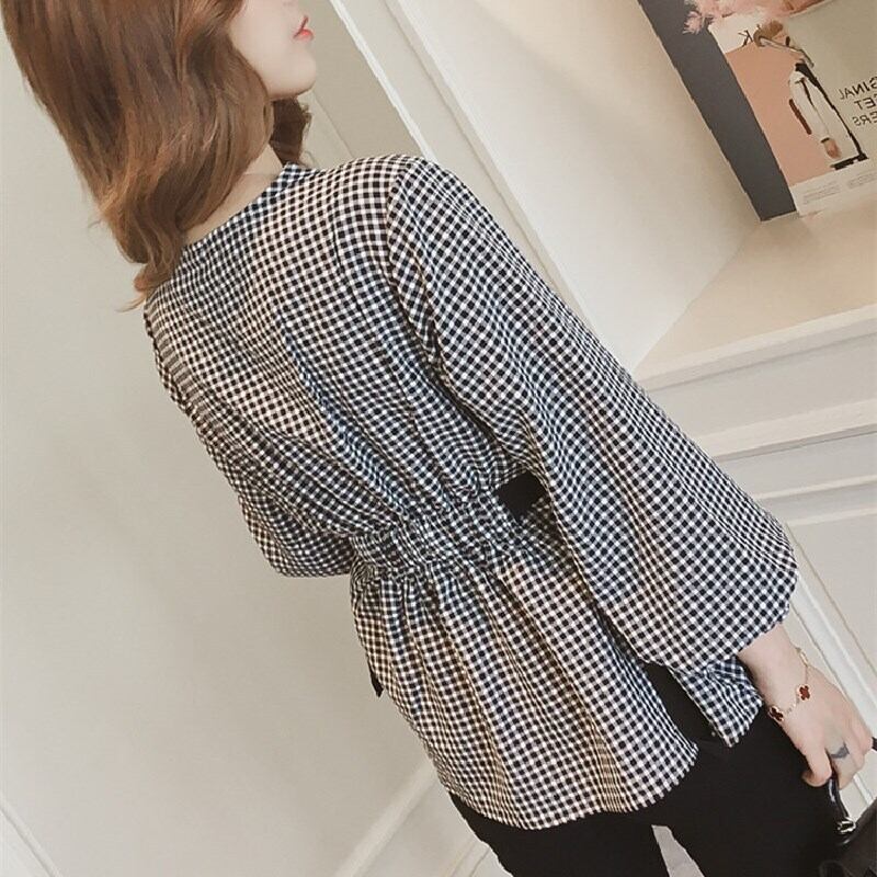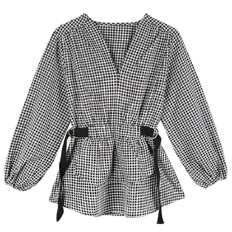 チェック柄パフースリープペプラムトップスブラウス 【DL-830】