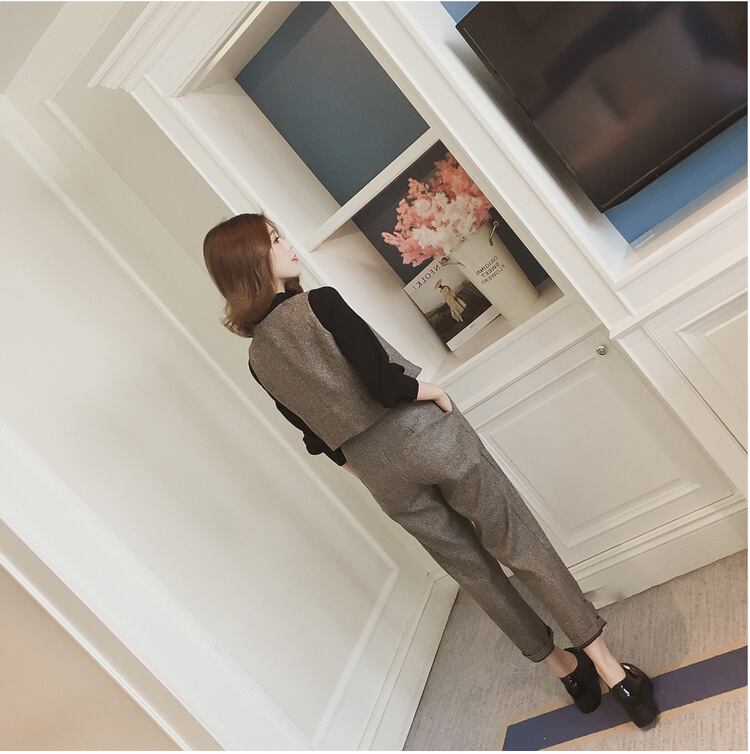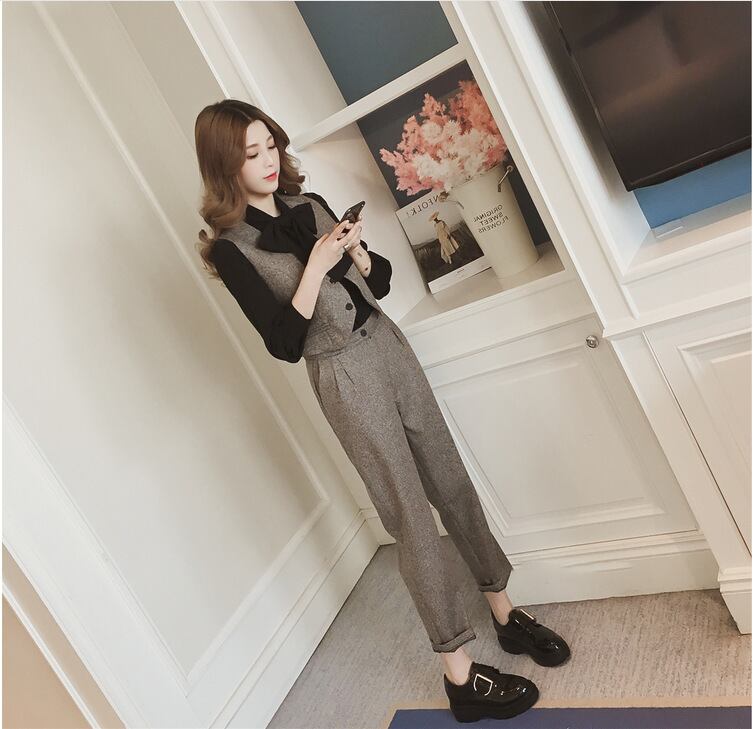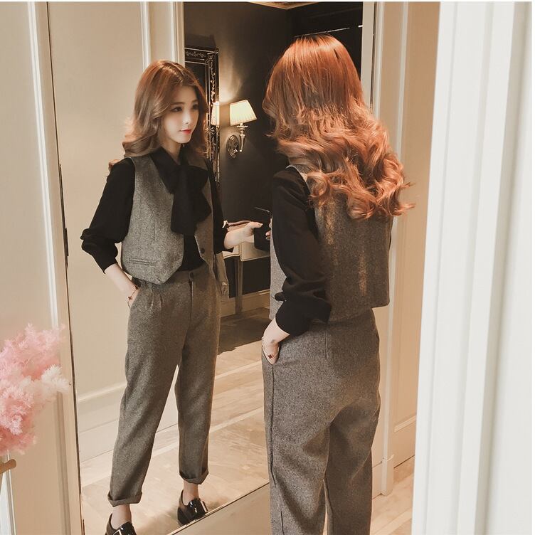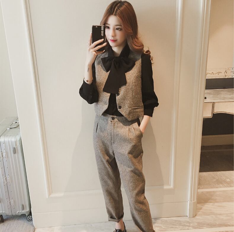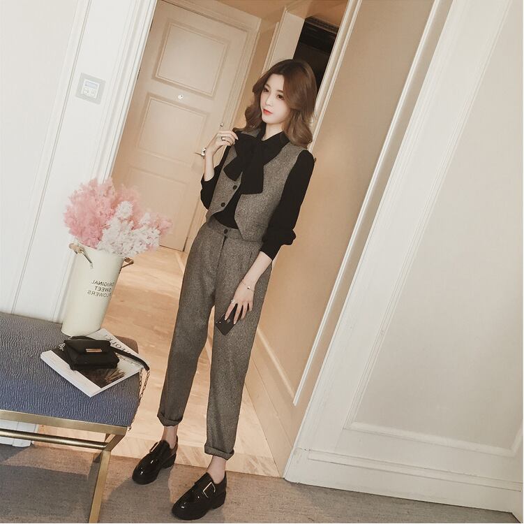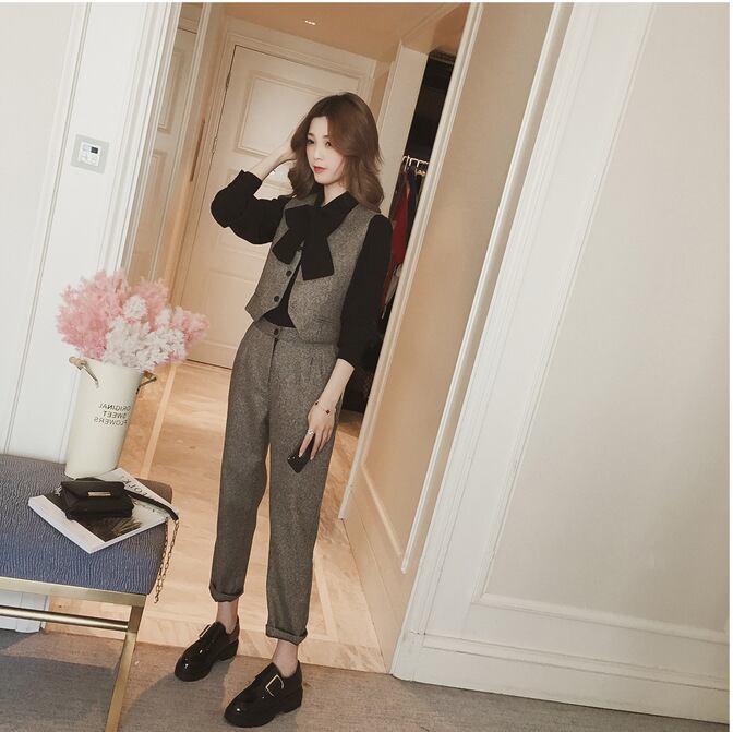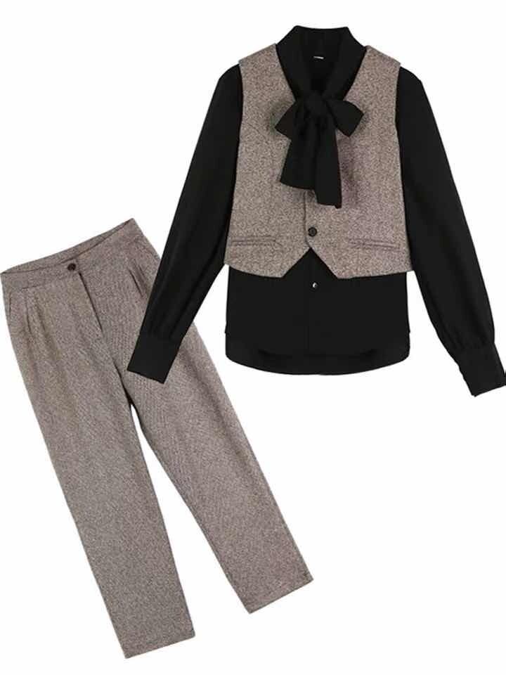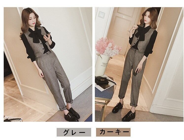 ベスト&ボウタイブラウス&カジュアルパンツ着回し3点セットアップ冬コーデ 【DL-1001】