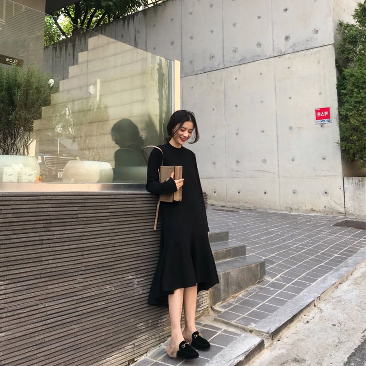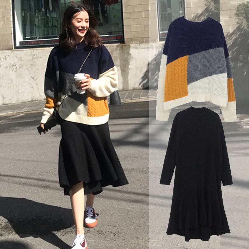 (単品注文)冬にぴったり 韓国系配色切り替えセーター Aライン膝下丈 ワンピース スカート 【DL-1032】