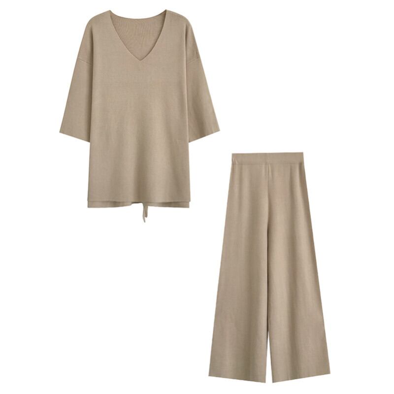 早い者勝ち レトロ無地プルオーバーvネックニットセーター ハイウエストパンツスーツ【DL-1402】