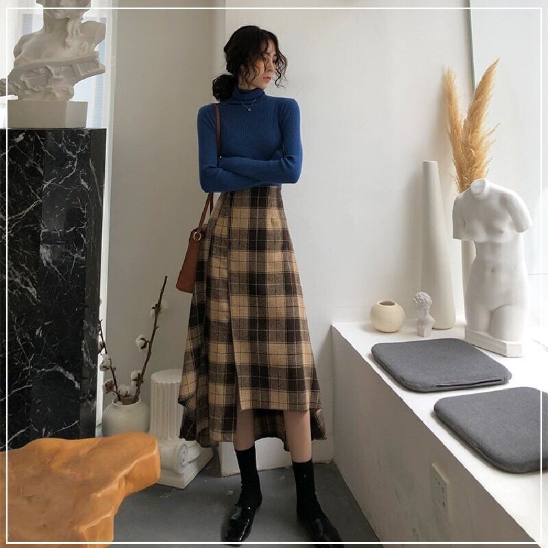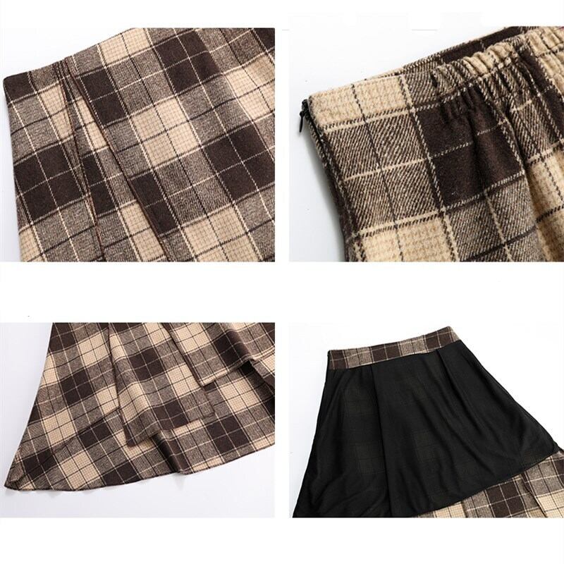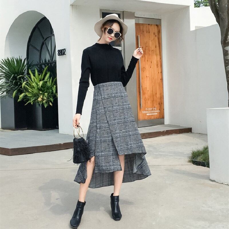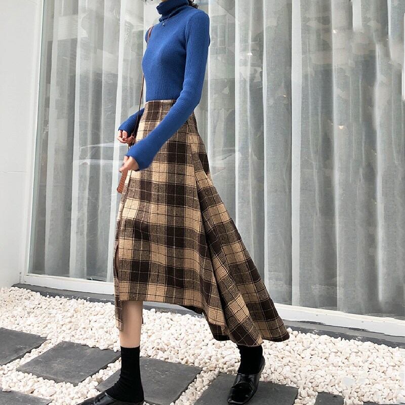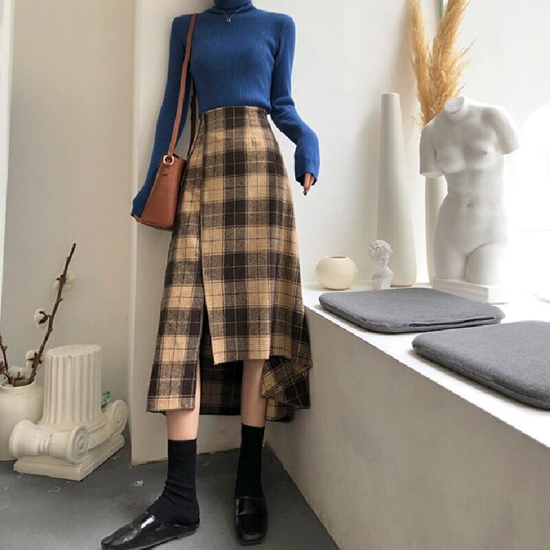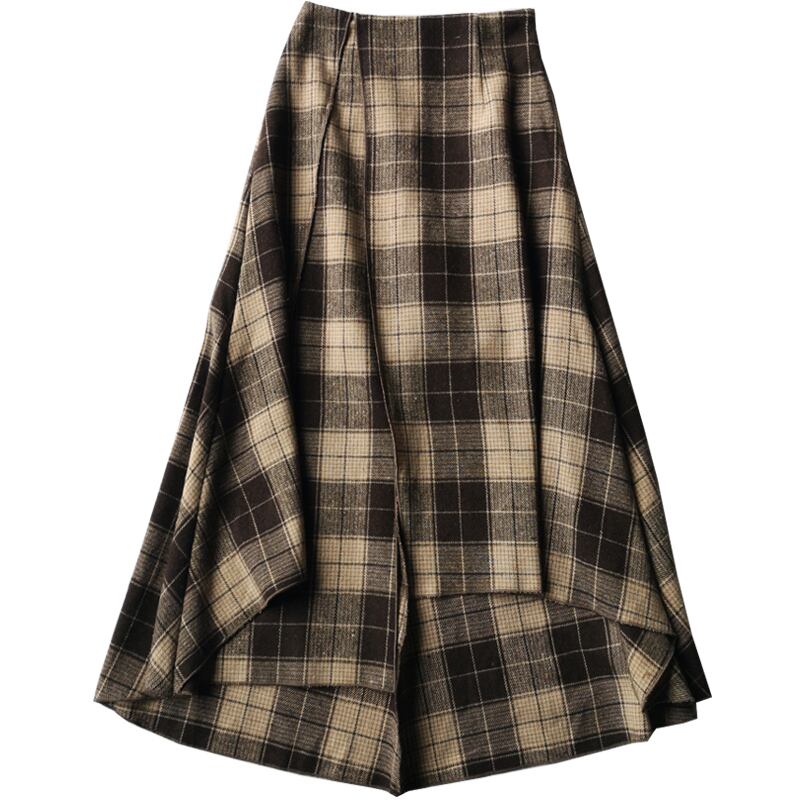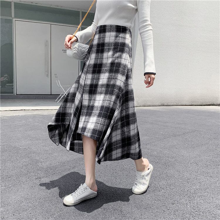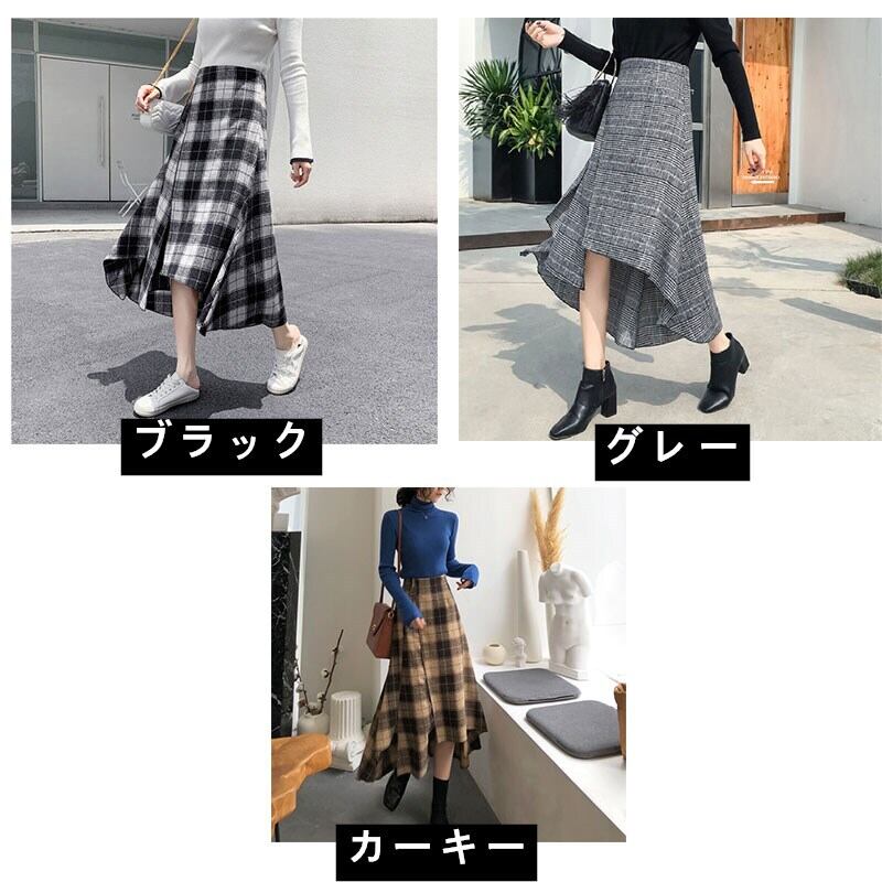 チェック柄スリット不規則ミモレスカートゴムおしゃれスカート 【DL-1876】
