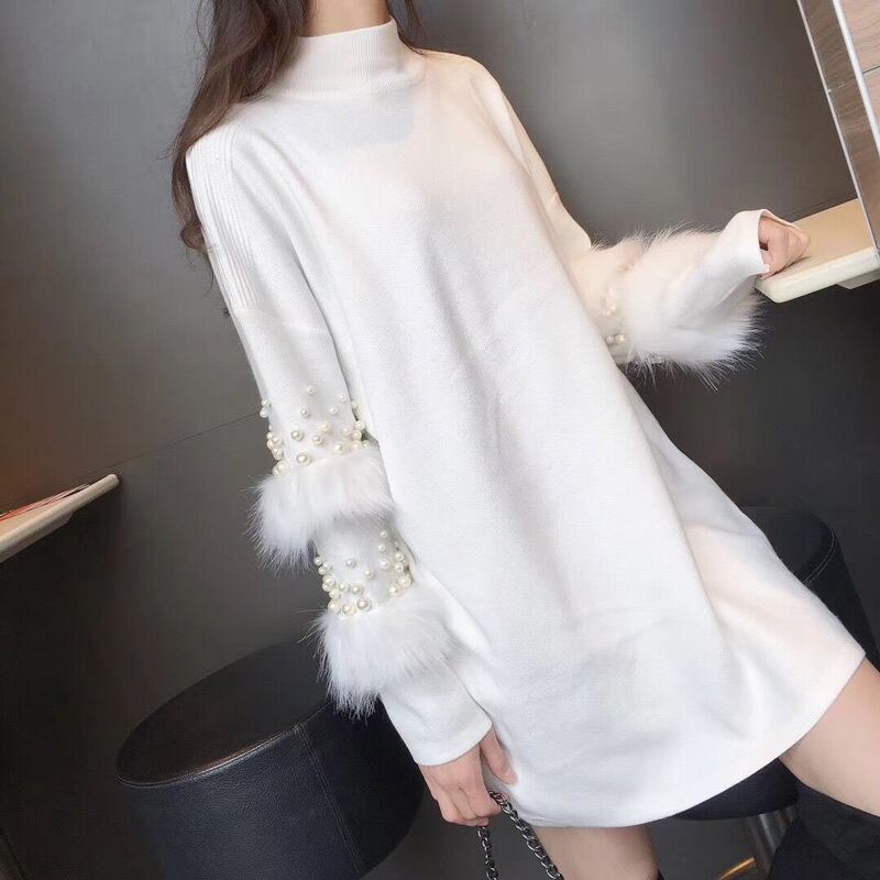 4カラー選択ファ付きニットワンピースビーズ付き大人可愛いデートワンピース 【DL-1214】