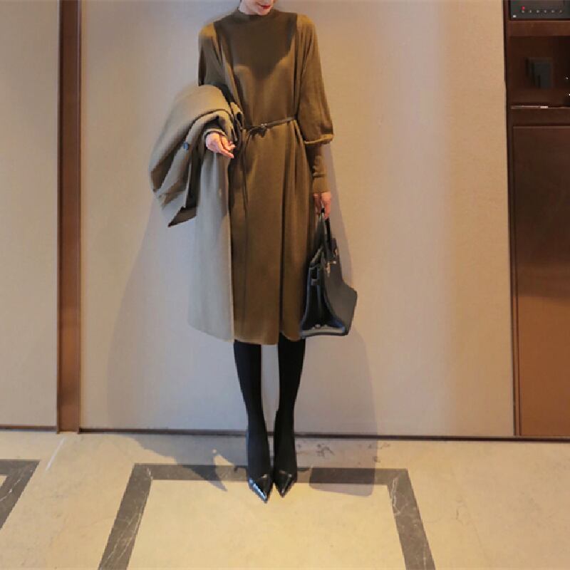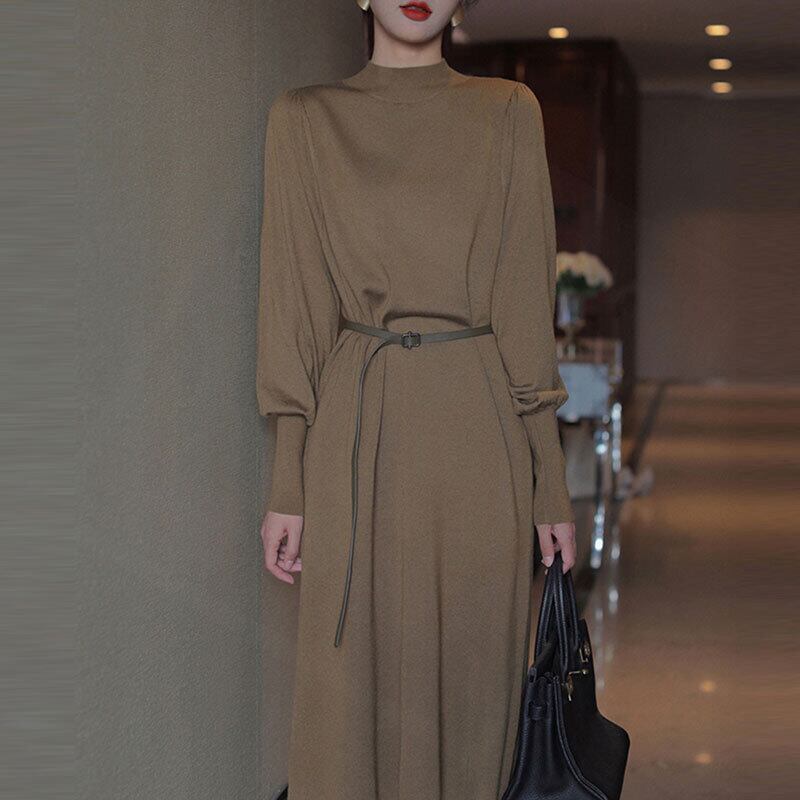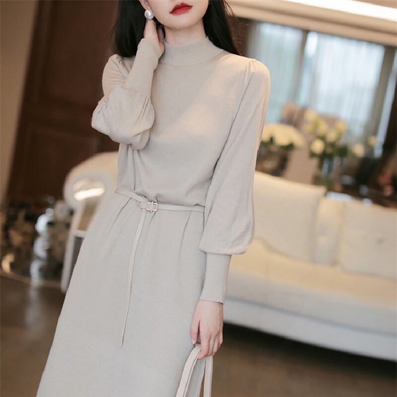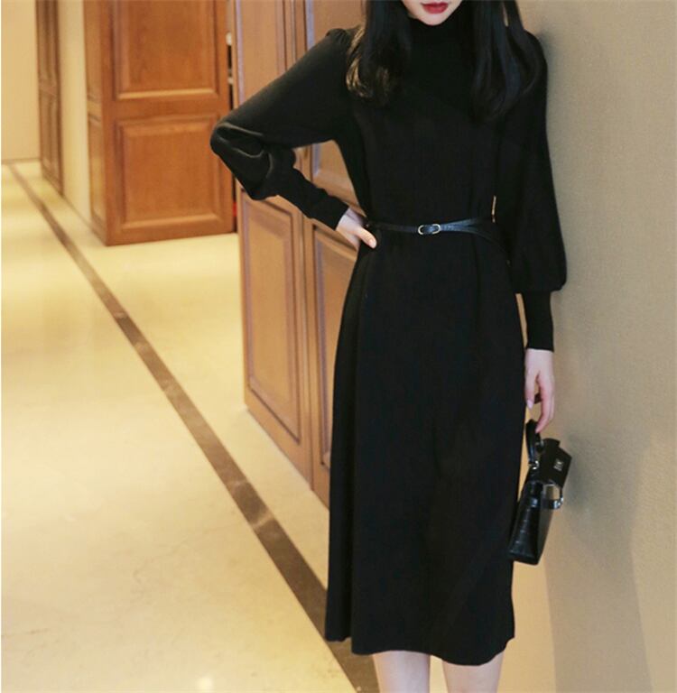 ニット無地やわらかニットワンピース優雅デート通勤ワンピースベルト付き 【DL-1236】