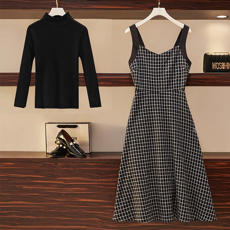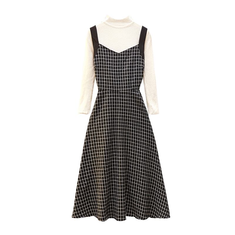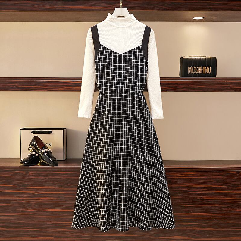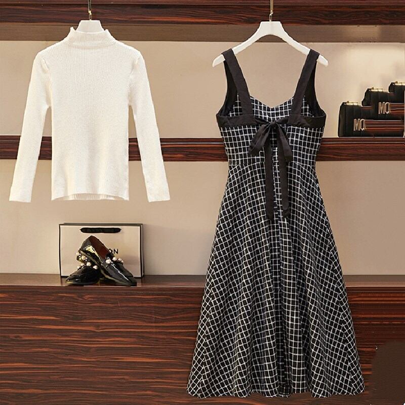 チェック柄リボンサスペンダーワンピース&無地ニットトップスセットアップ大人可愛いデート 【DL-1080】