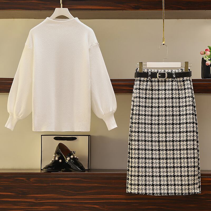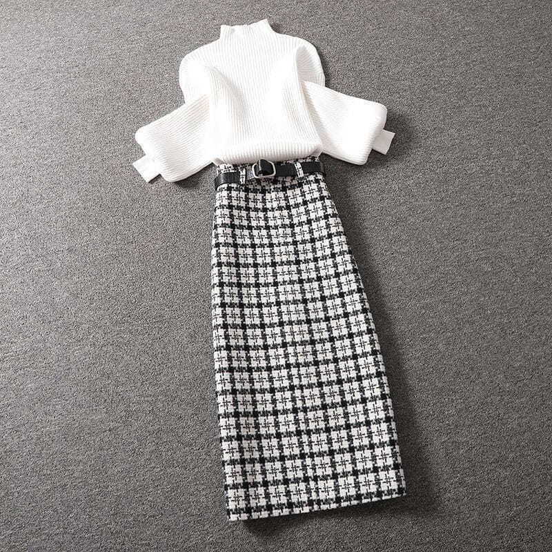 シンプルニット・セーター&チェック柄Hラインスカートセットアップデートコーデ 【DL-1081】
