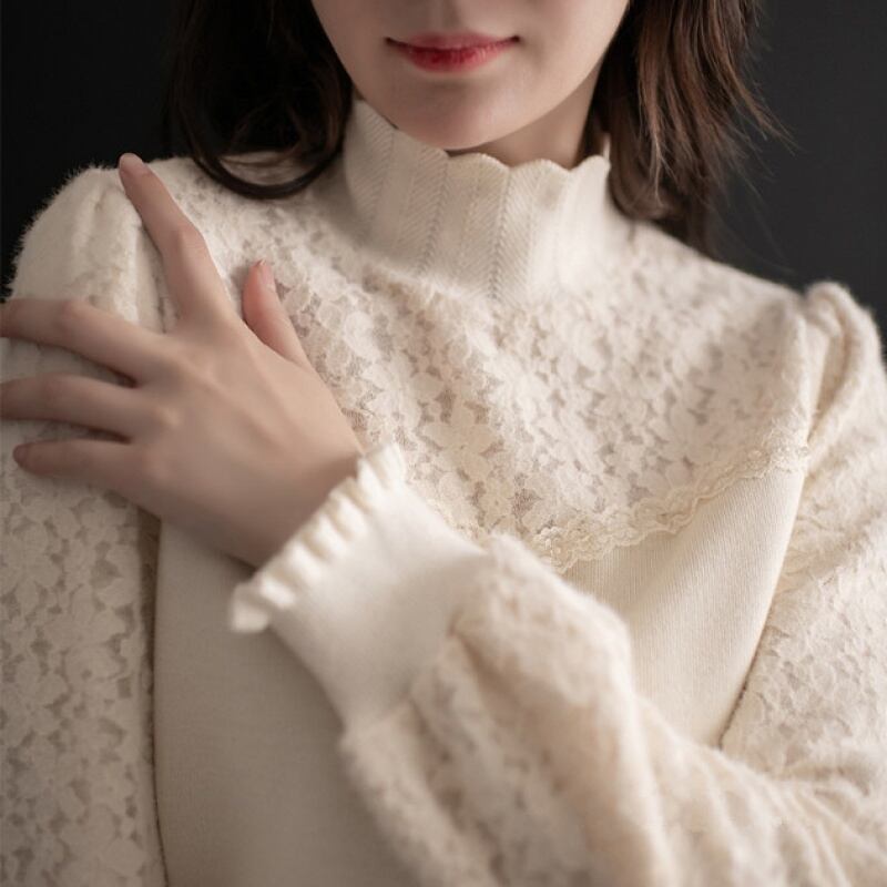 レース切り替えニットフレア裾無地ハイネックセータートップス 【DL-1460】