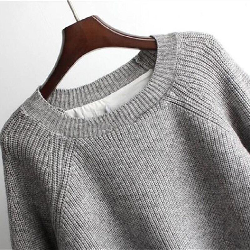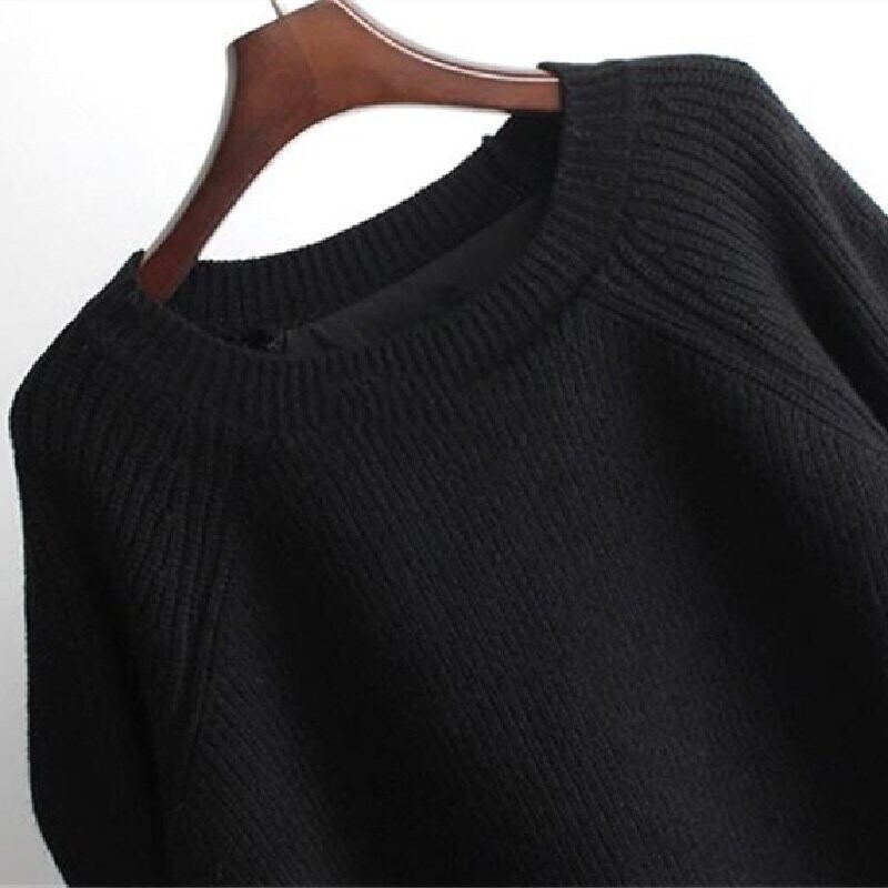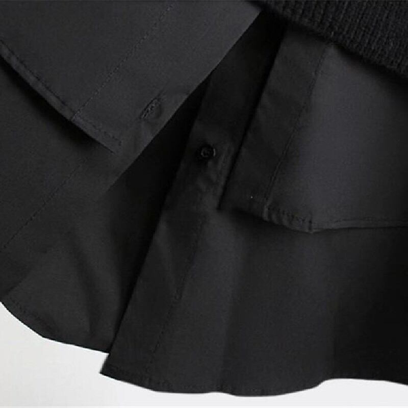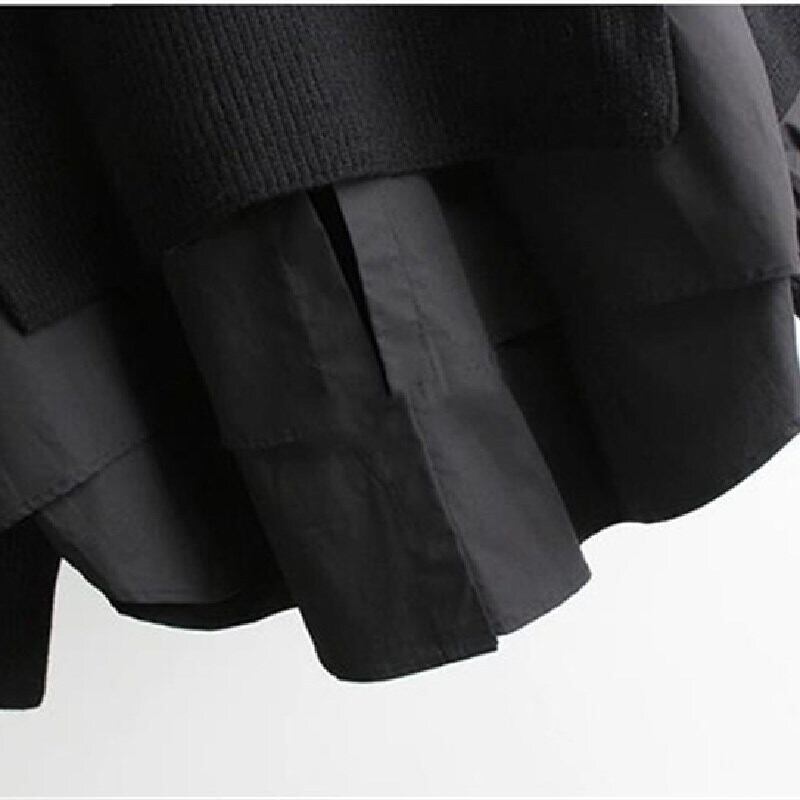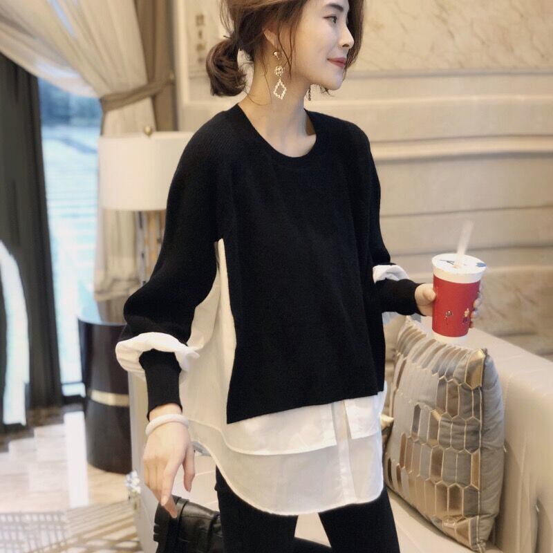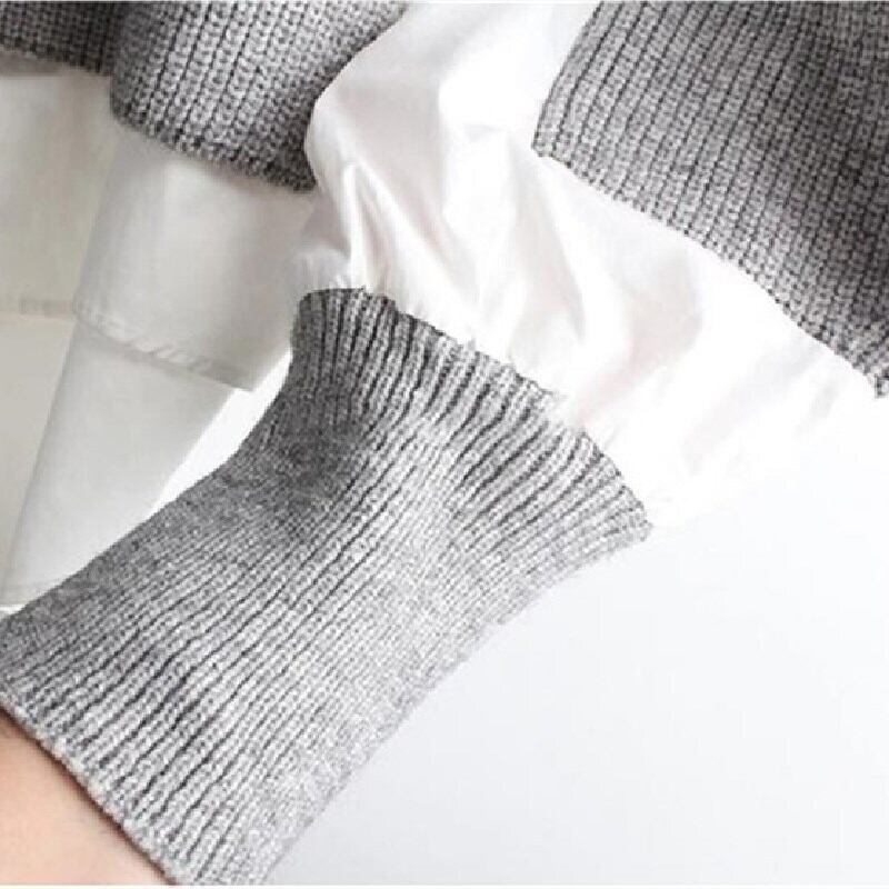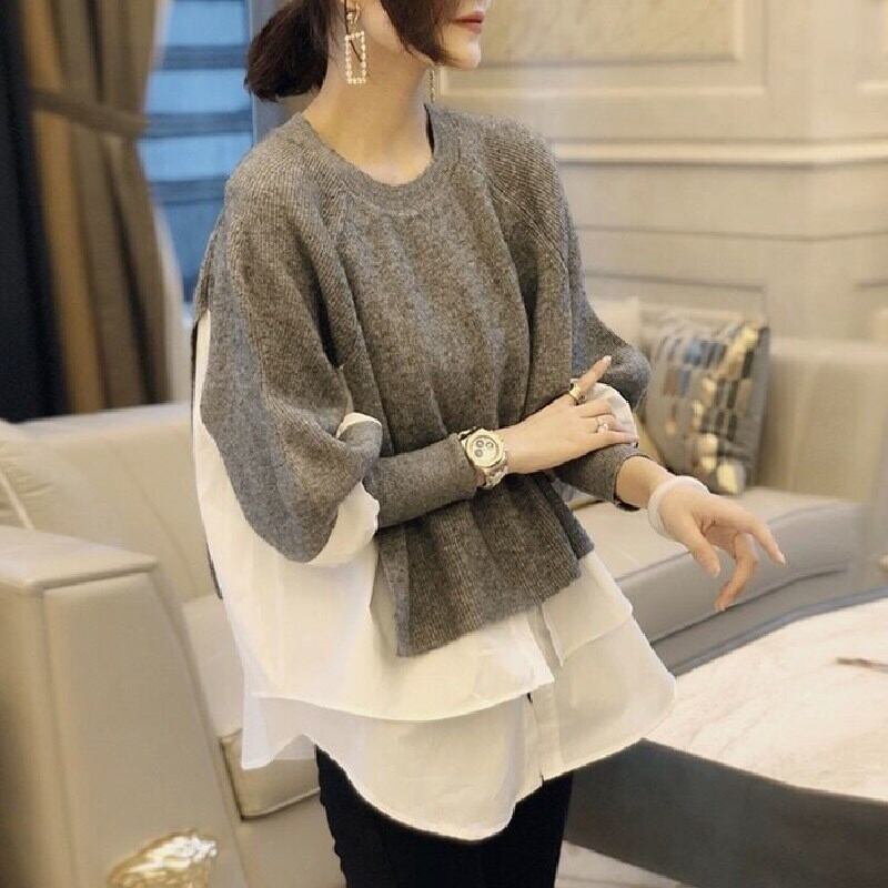 フェミニン無地切り替えラウンドネックランタンスリーブフェイクレイヤードニットセーター 【DL-1472】