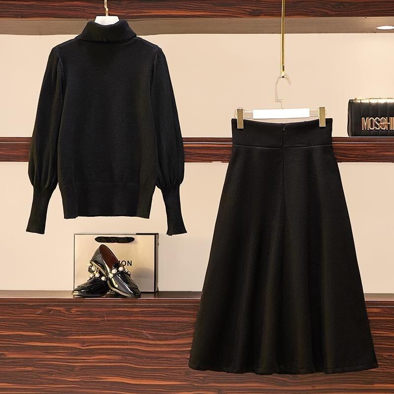 パフスリーブハイネックニット・セーター&Aラインスカートセットアップ着回しデートコーデ 【DL-1094】
