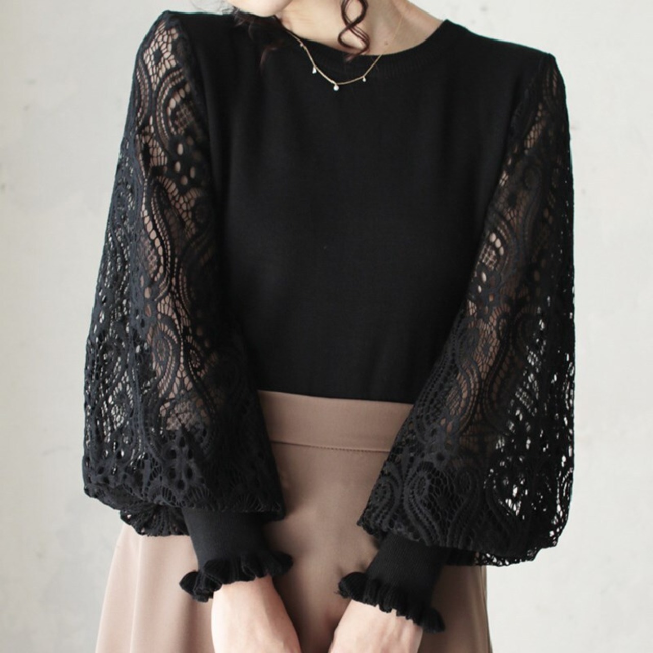 レース透かし彫りパフスリーブニットウェアトップスTシャツ 【DL-1477】