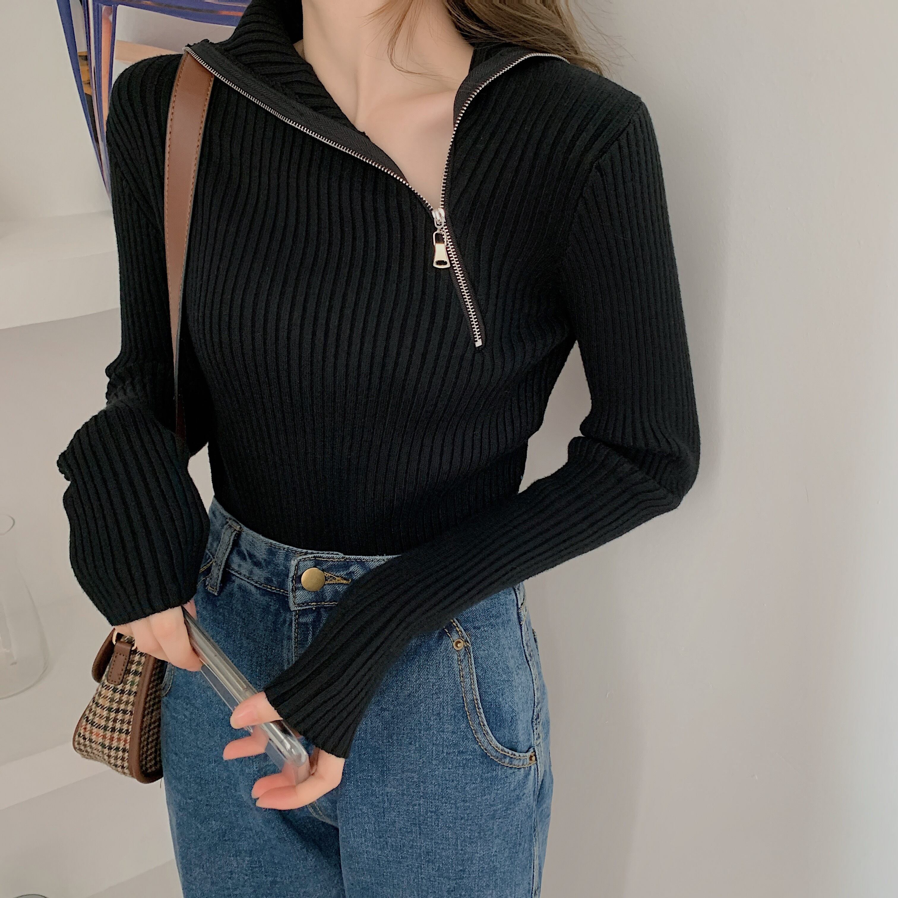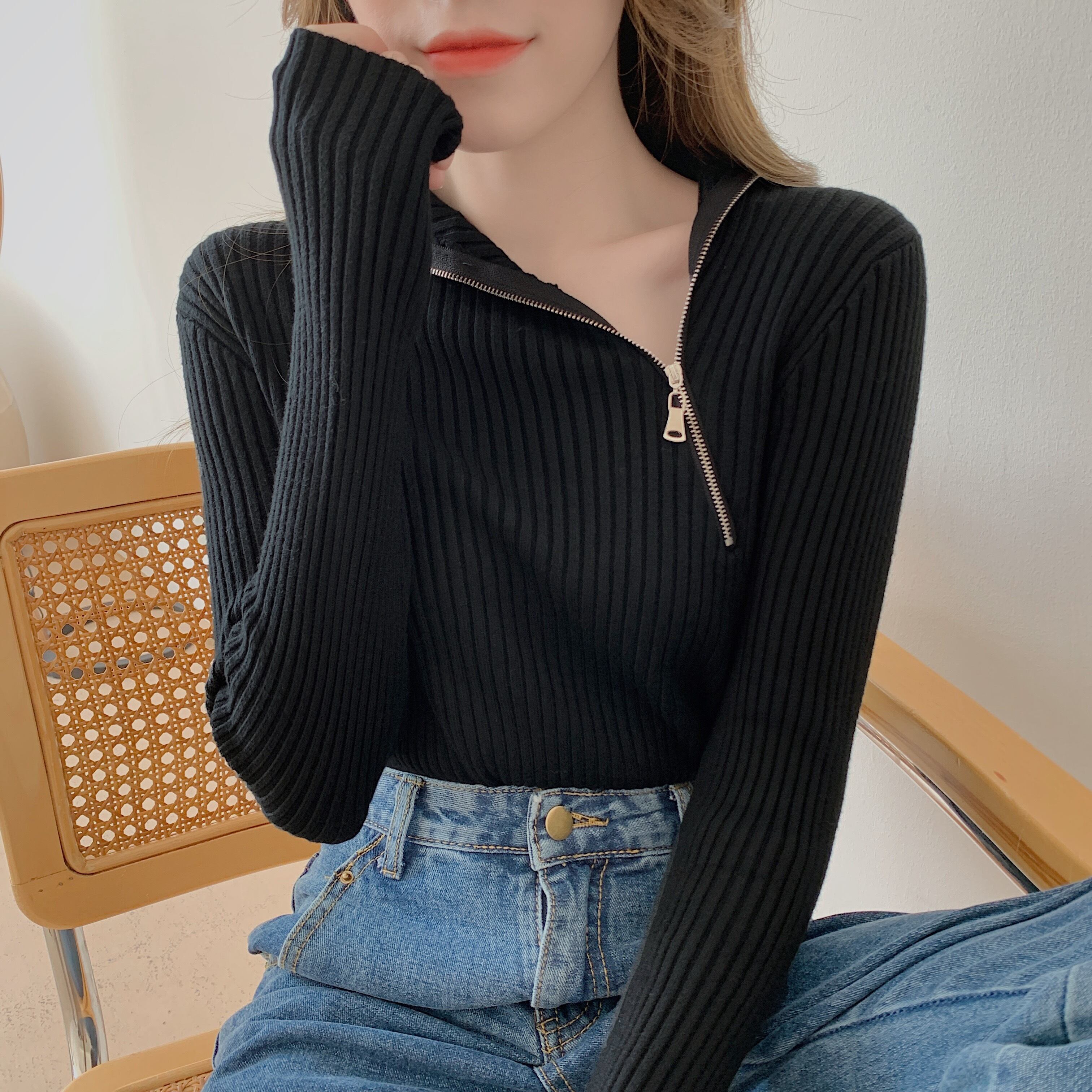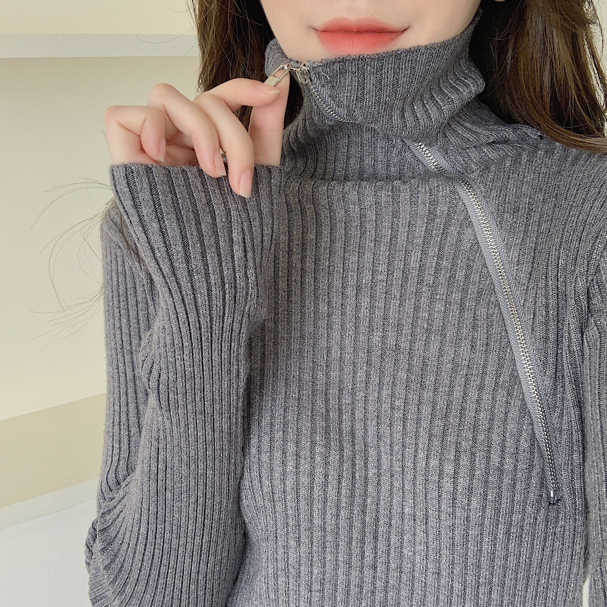 4カラー選択ジッパー付きカットソー冬春ストライプ折ネックハイネックニットトップス 【DL-1492】