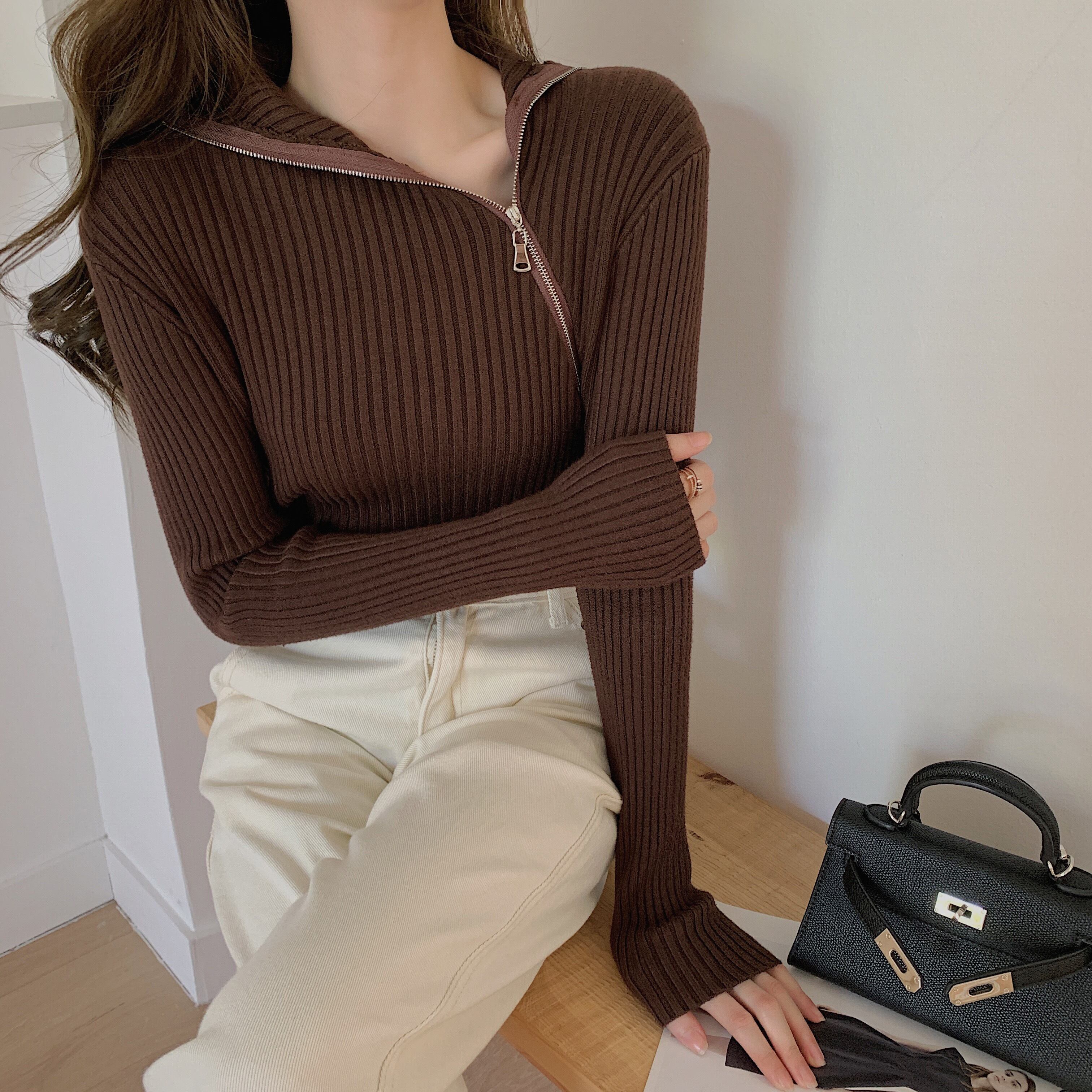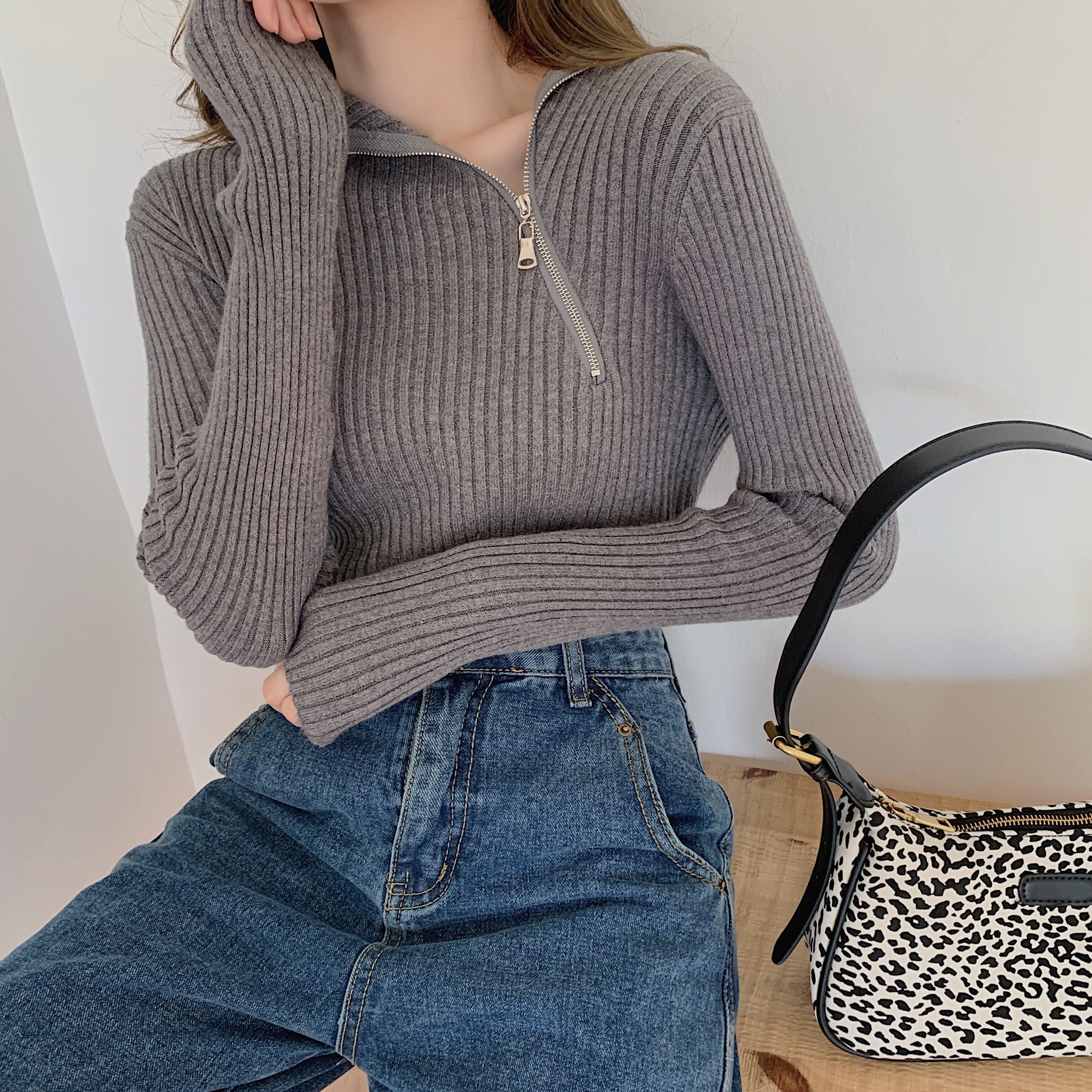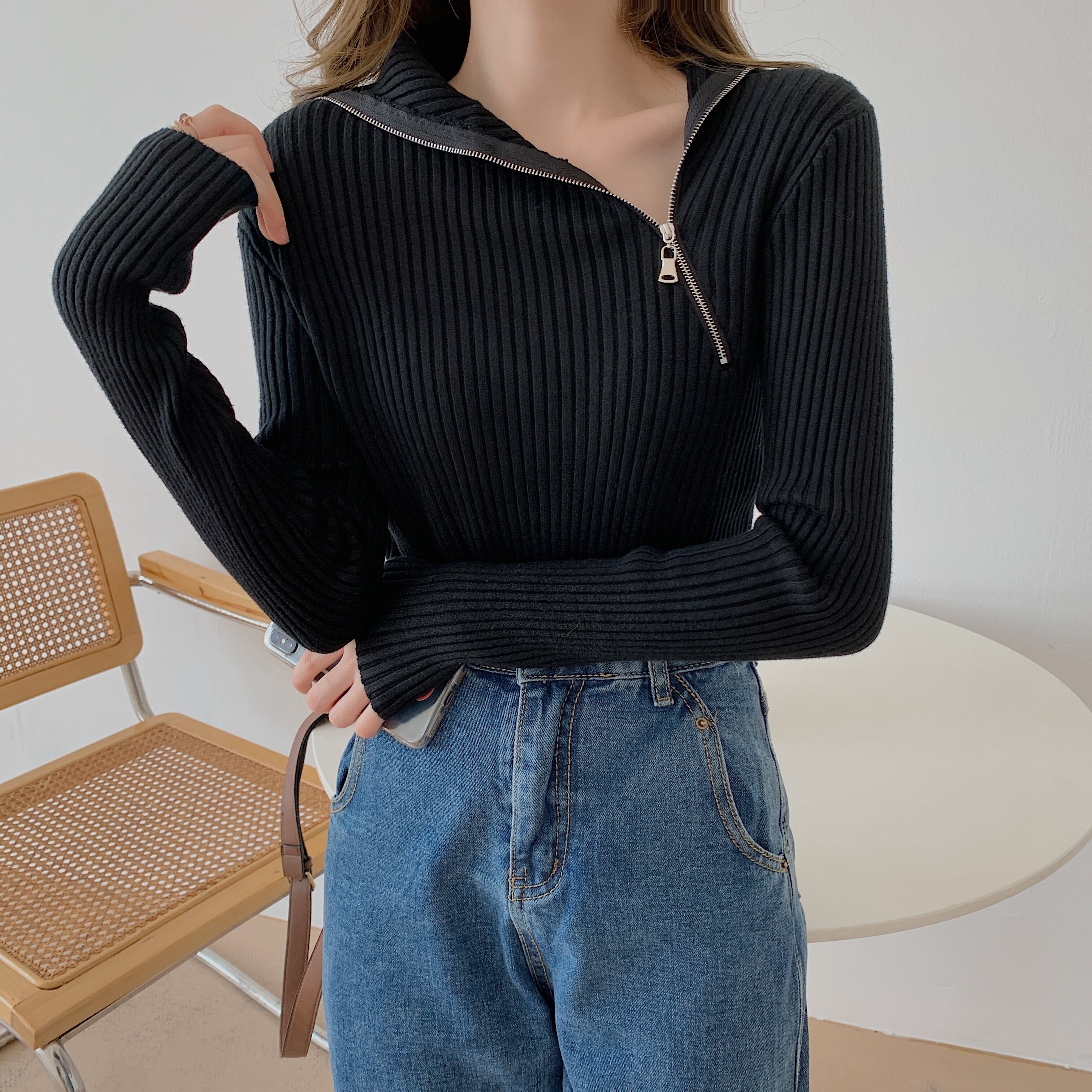 4カラー選択ジッパー付きカットソー冬春ストライプ折ネックハイネックニットトップス 【DL-1492】