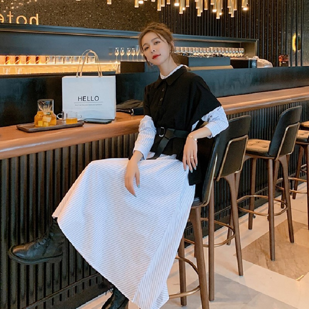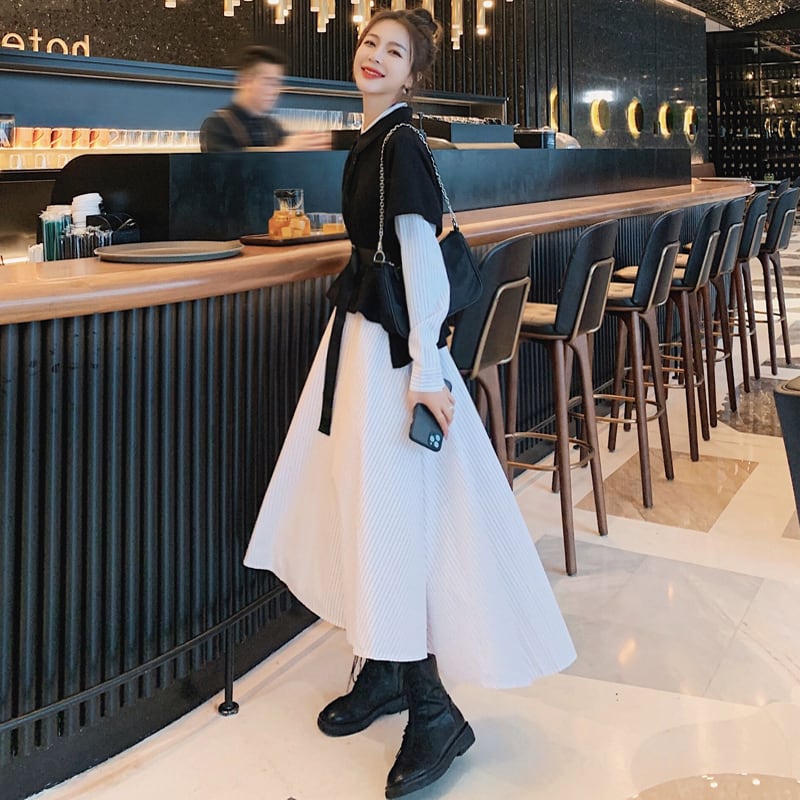 ストライプ柄ワンピース&ニットベストセットアップ 【DL-1127】