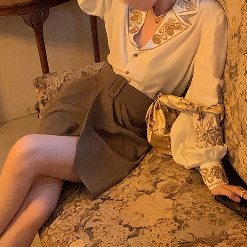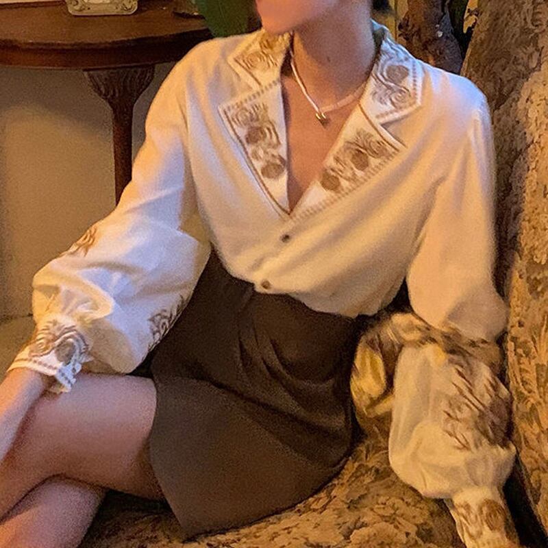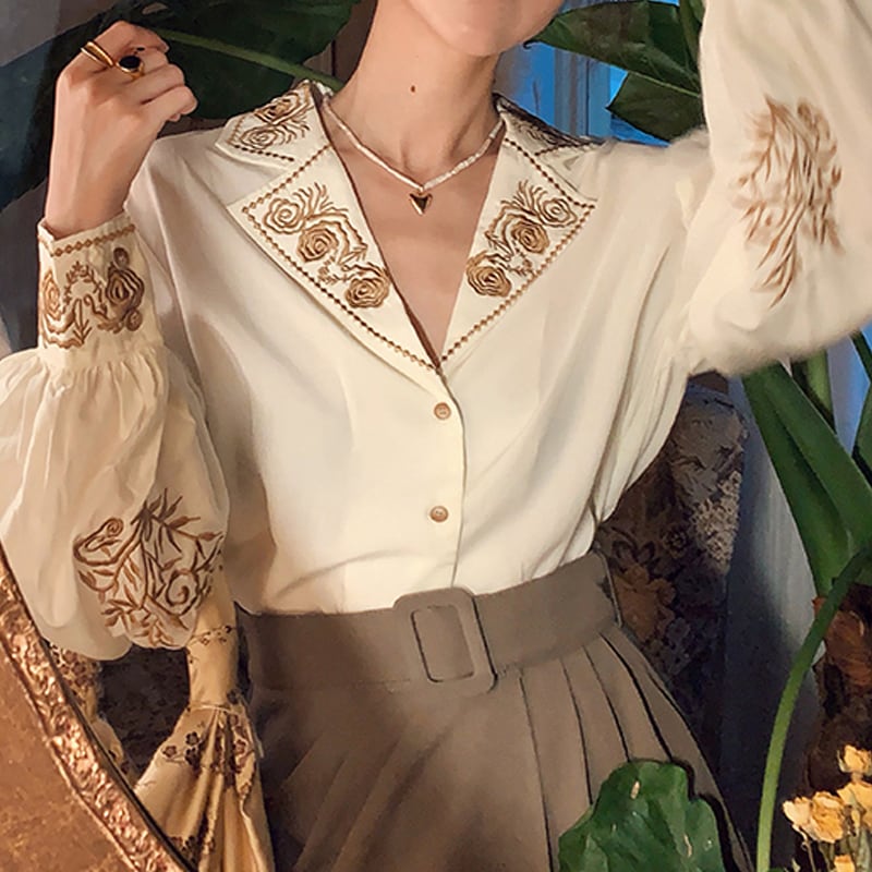 パフスリープエスニック刺繍花柄シャツ・ブラウストップス 【DL-1521】