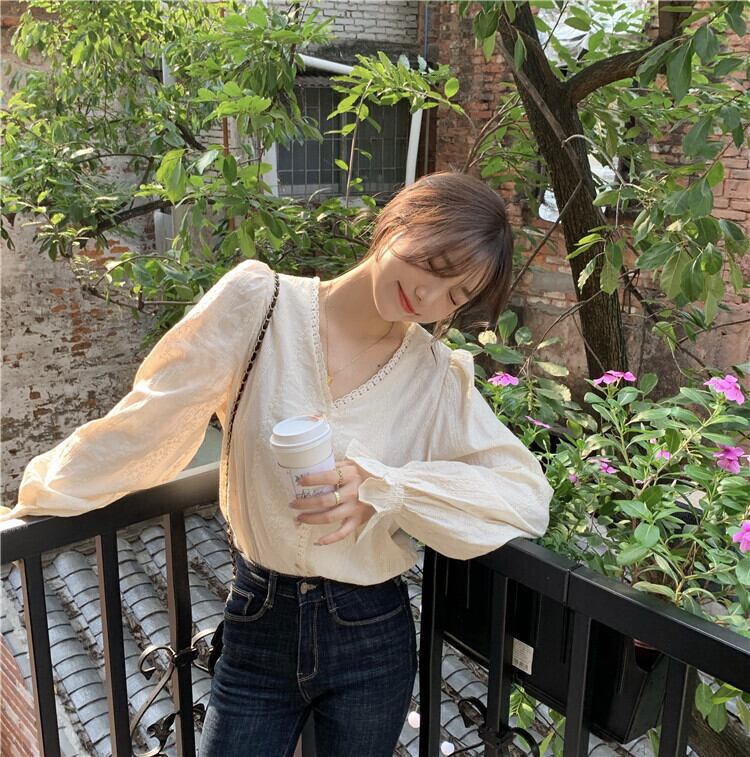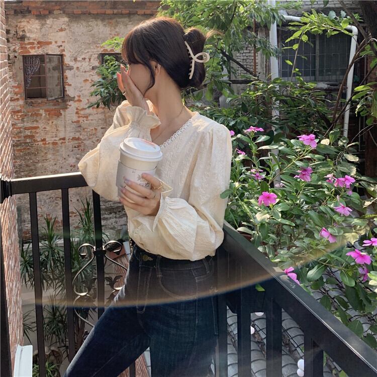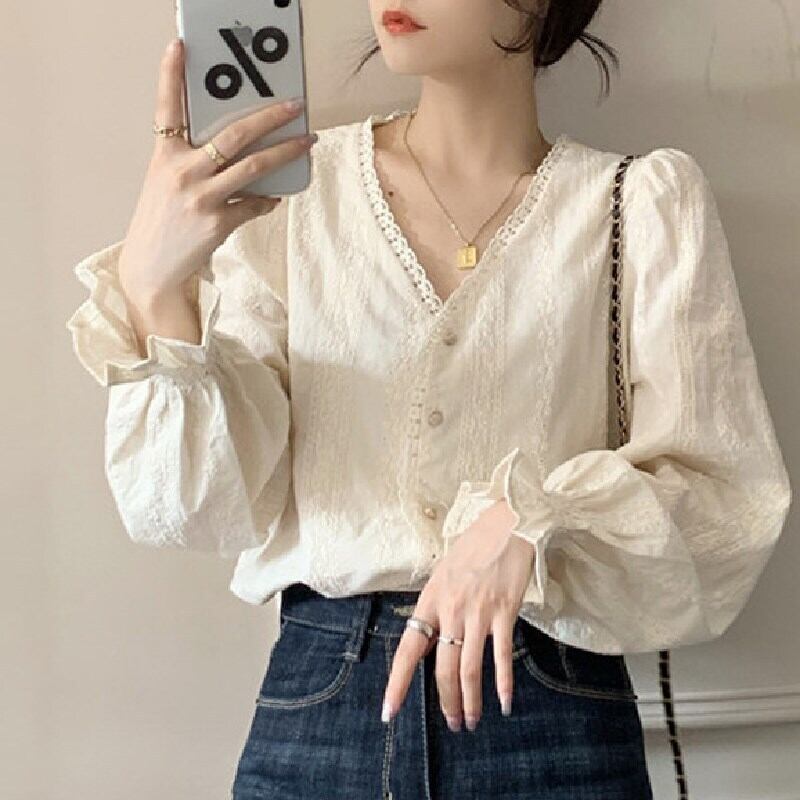 トラペット袖レース切り替えブラウストップス 【DL-1525】