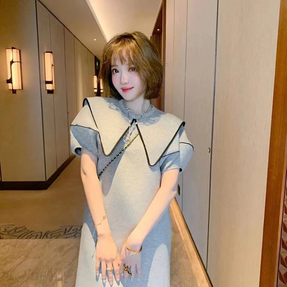 レデイースファッショングレー無地パフスリーブ大人可愛いゆったりカジュアルワンピース【DL-2508】