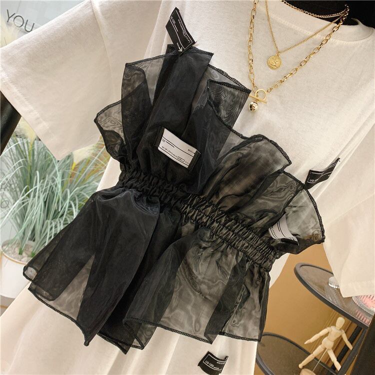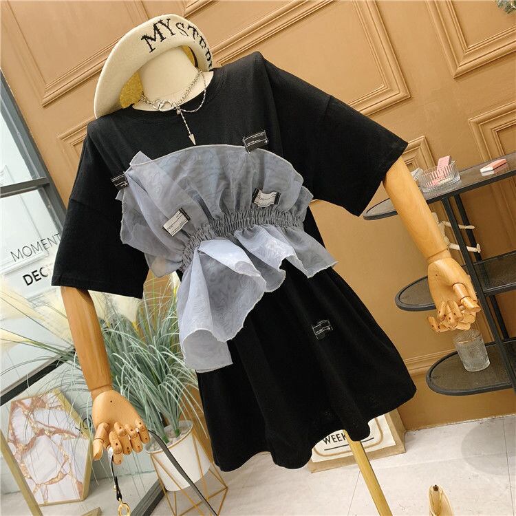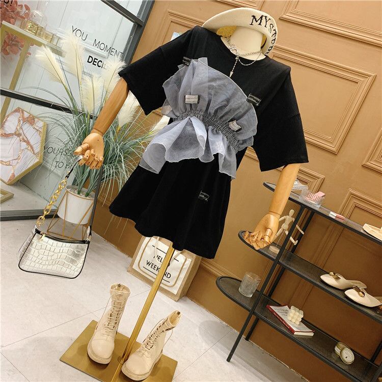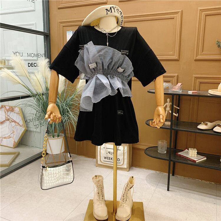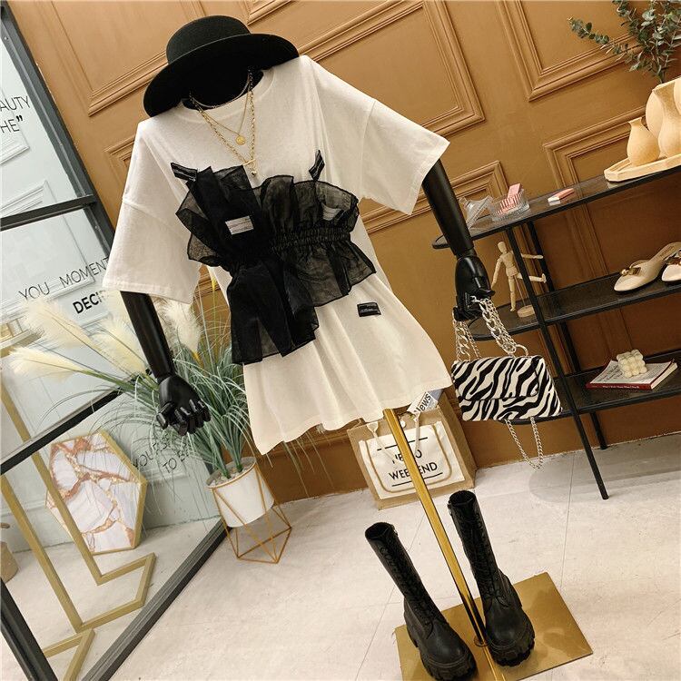 デザインスタイルカジュアルコーデしやすい半袖気質ネットヤーン切り替えTシャツ【DL-2557】
