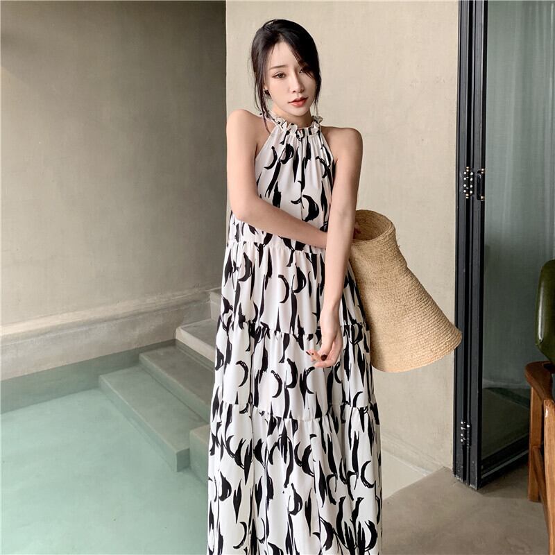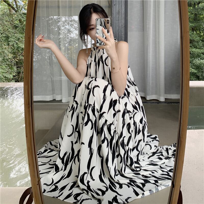 人気沸騰ファッションプリント飾る無袖ゆったり着痩せ効果ロングカジュアルワンピース【DL-2577】
