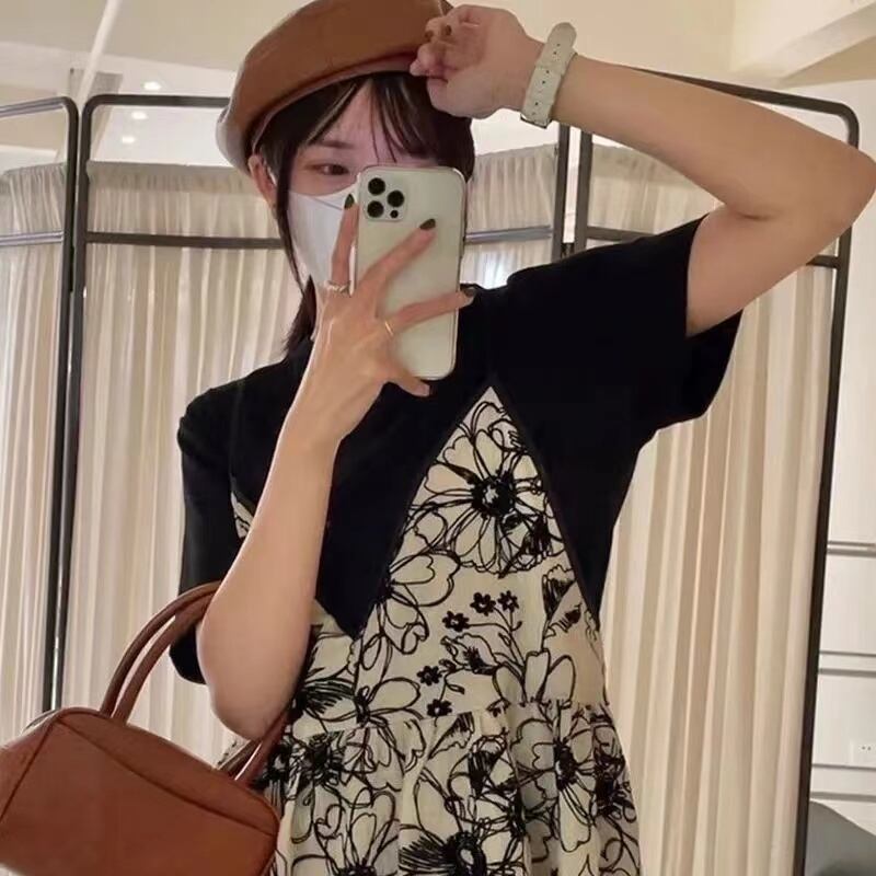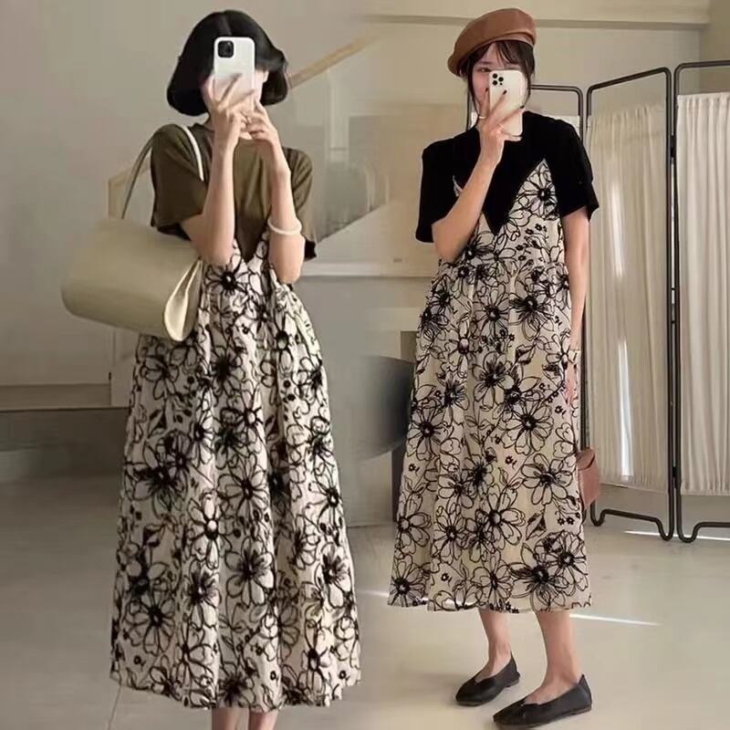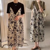 ゆったりコーデしやすい着痩せ効果Tシャツトップス&花柄ロングファッションサスペンダーデートワンピースセットアップ【DL-2584】
