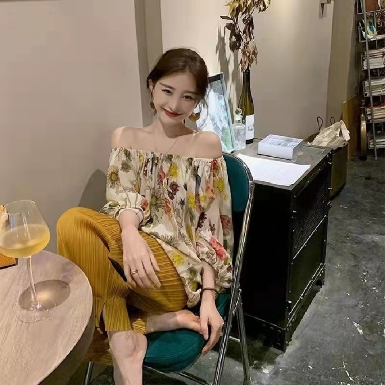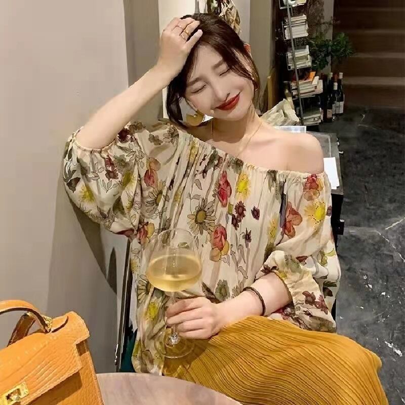 花柄オフショルダーシャツ・ブラウストップス&無地高級感ワイドレッグパンツセットアップ【DL-2586】